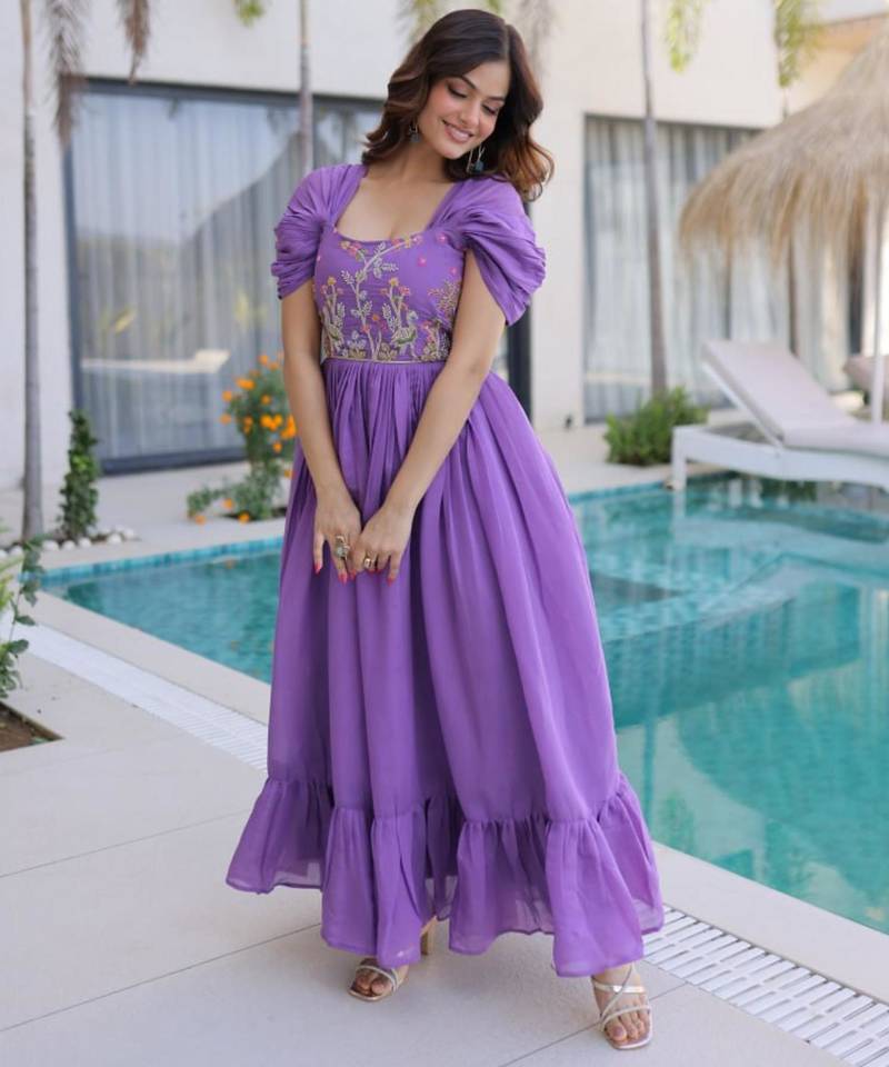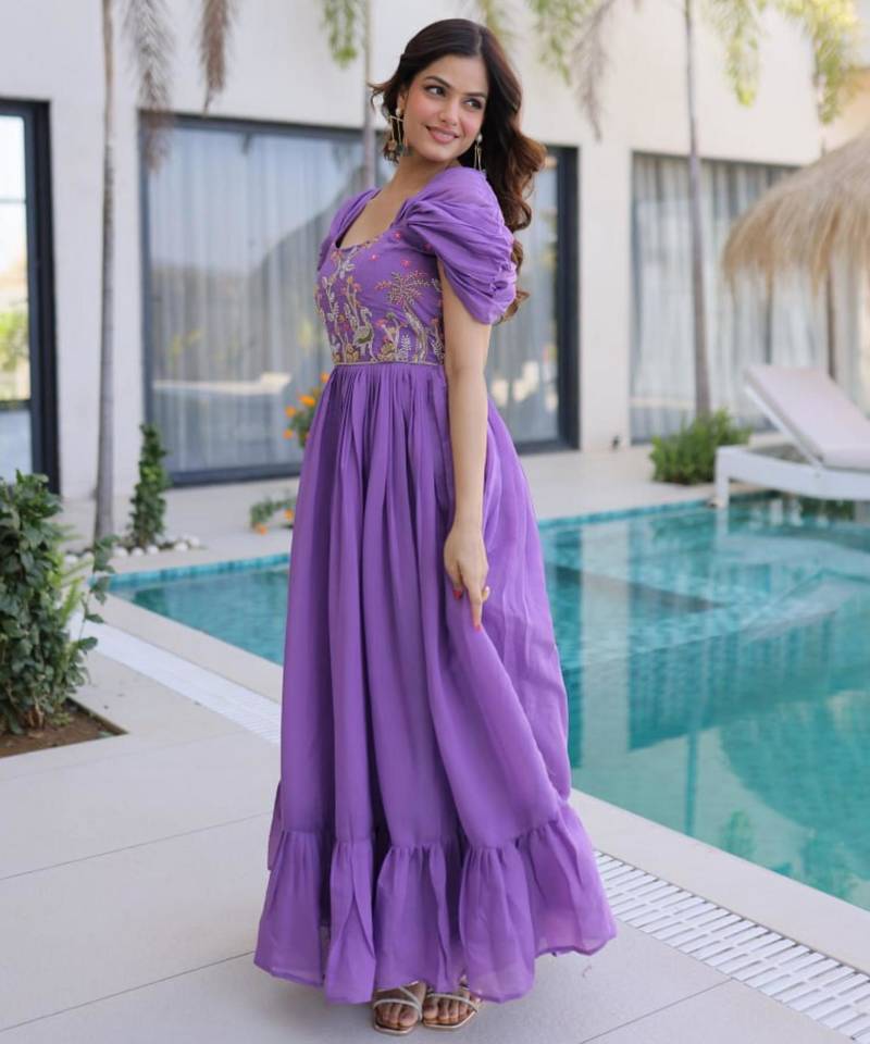 | Product Name | Purple Mal Chanderi Beads Embroidery Work Western Gown | |
