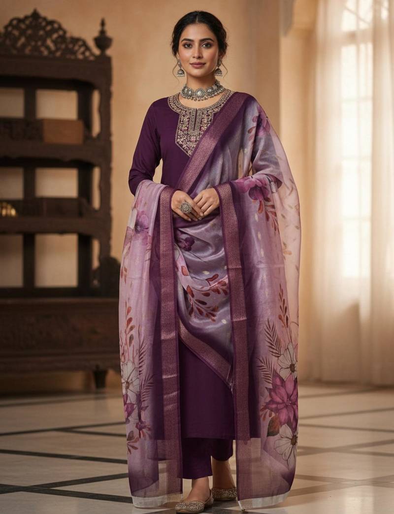 Wine coding sequence embroidered kurta with trouser & dupatta stitched