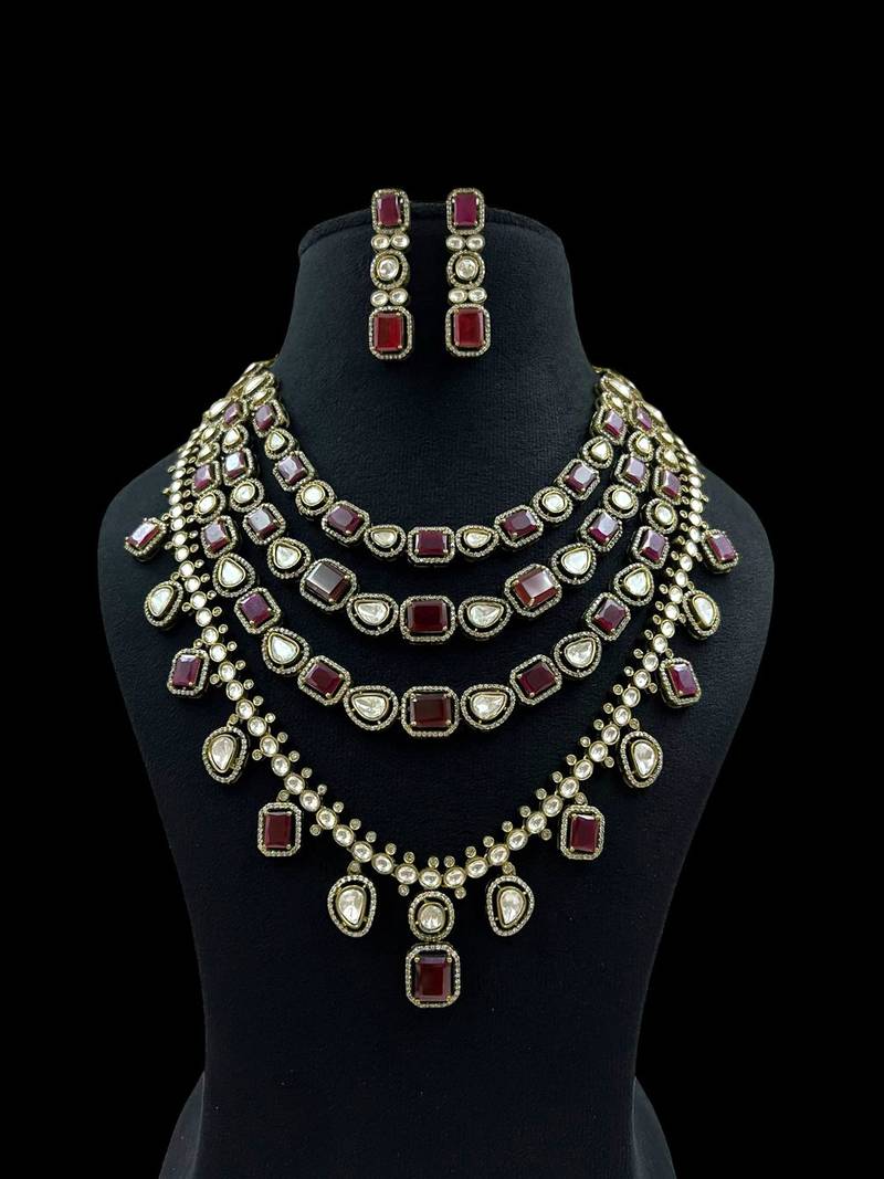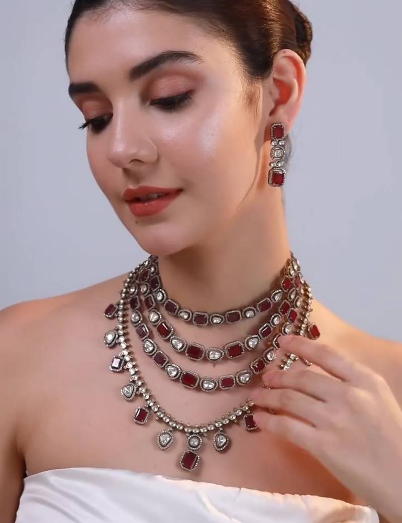 | Product Description | Enhance Your Regal Charm With This Exquisite Kundan Ruby Stone Necklace Set, Beautifully Handcrafted To Perfection. The Multi Layered Necklace Features A Captivating Combination Of Deep Red Ruby Stones And Premium White Kundan Gems, Creating A Perfect Blend Of Tradition And Luxury. Each Layer Is Delicately Designed With Precision Cut Stones Set In Antique Gold Plating, Exuding An Aura Of Royal Sophistication. |