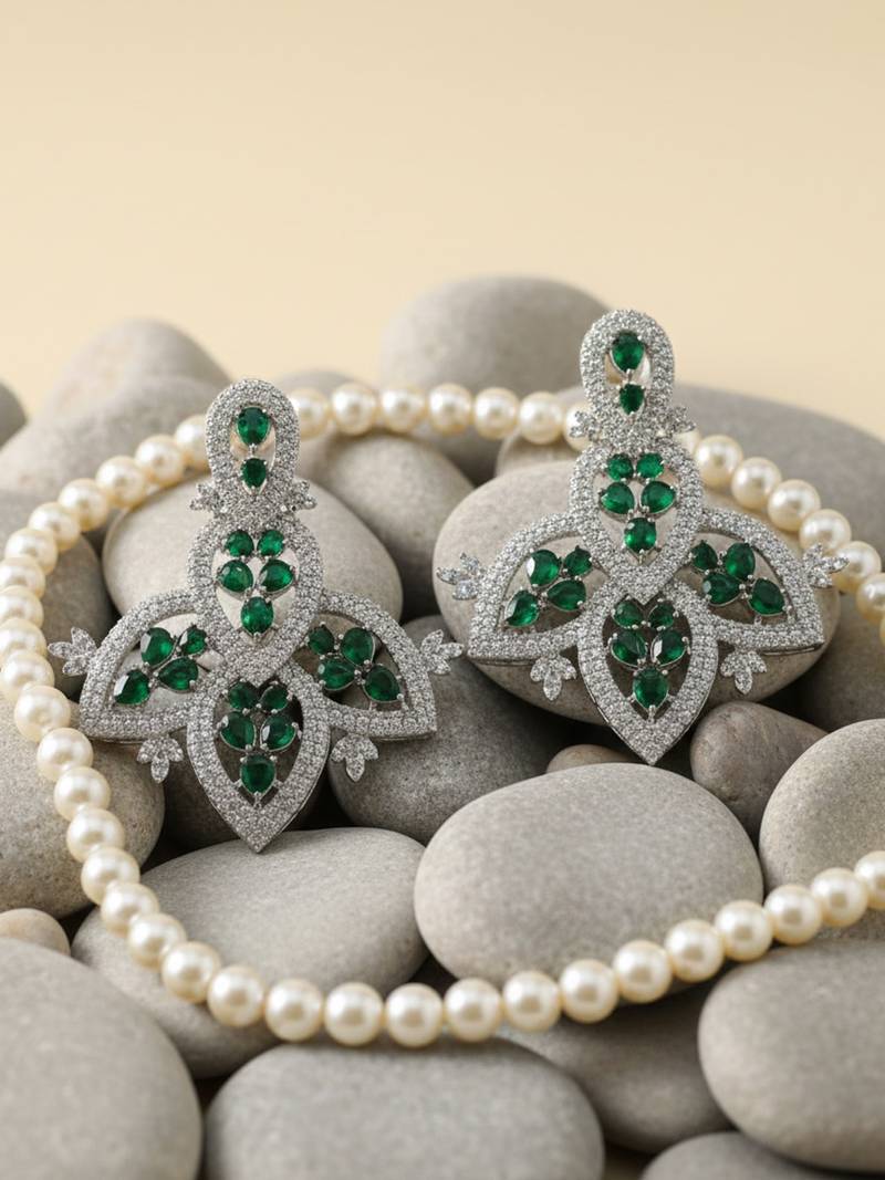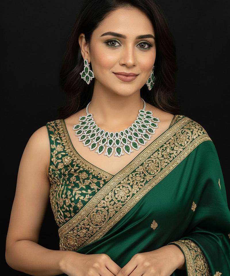 | Product Description | Made In Brass Metal With A Premium Silver Polish For A Shining, Elegant Finish.Designed With Beautiful Green Doublet Stones For A Rich And Royal Bridal Look.Embellished With Sparkling Cz Stones That Add Extra Shine And Glamour.Wide, Heavy Bridal Design That Sits Beautifully On The Neckline.Comes With Matching Earrings To Complete The Full Bridal Set.Perfect For Weddings, Receptions, And Grand Traditional Functions. |