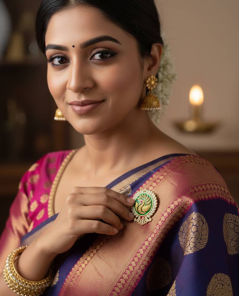 | Product Description | Made In Durable Metal Brass With Premium Silver Polish Set With A Beautiful Lavender Doublet As The Center Stone Sparkling Moissanite Polki Stones Enhance The Shine Elegant Victorian Style Design With Fine Detailing Perfect For Sarees, Gowns, And Statement Fashion Looks Lightweight And Easy To Pin On Any Outfit |