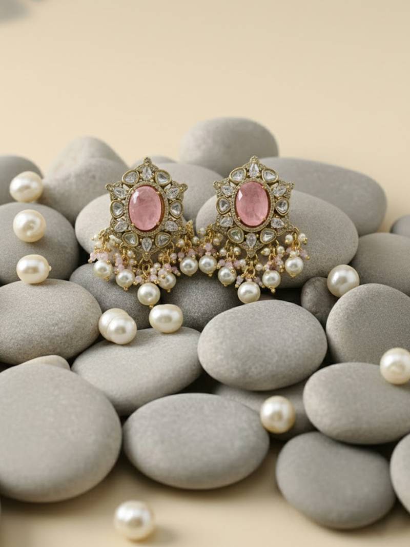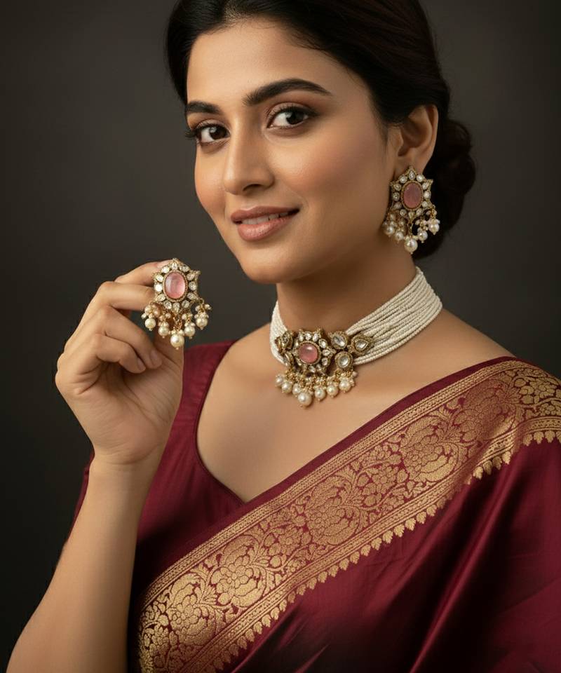 | Product Description | Crafted In Premium Brass Metal With A Rich Victorian Polish.Features Elegant Pink Doublet Stones For A Soft And Classy Look.Detailed With Sparkling Moissanite Polki And Cz Stones For Extra Shine.Multi Strand Pearl Choker Adds A Royal And Traditional Touch.Comes With Matching Heavy Earrings For A Complete Festive Set.Perfect For Weddings, Receptions, And Traditional Celebrations. |