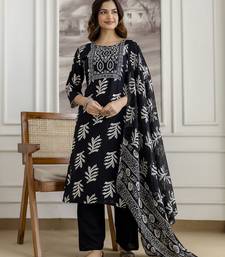 Black pure cotton leaf print embroidery work anarkali kurta pant with dupatta stitched