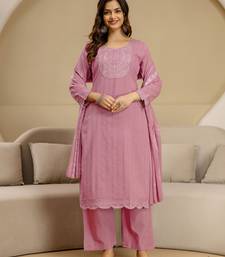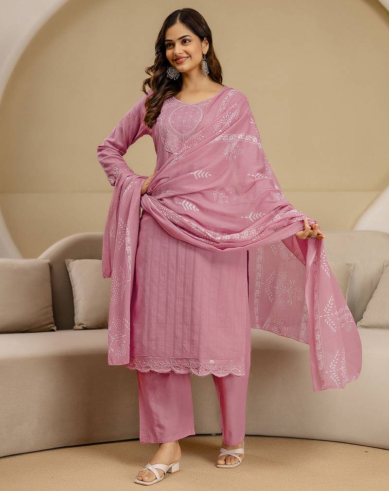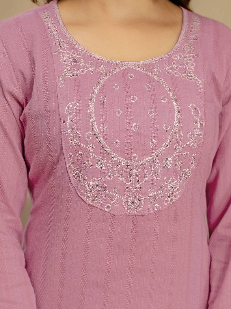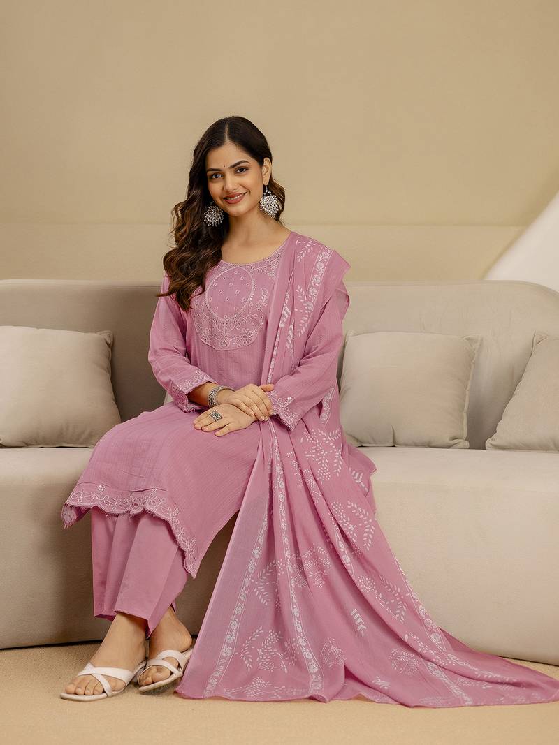 Lightpink pure cotton embroidery sequence work kurta pant with ethic motifs print dupatta set stitched
