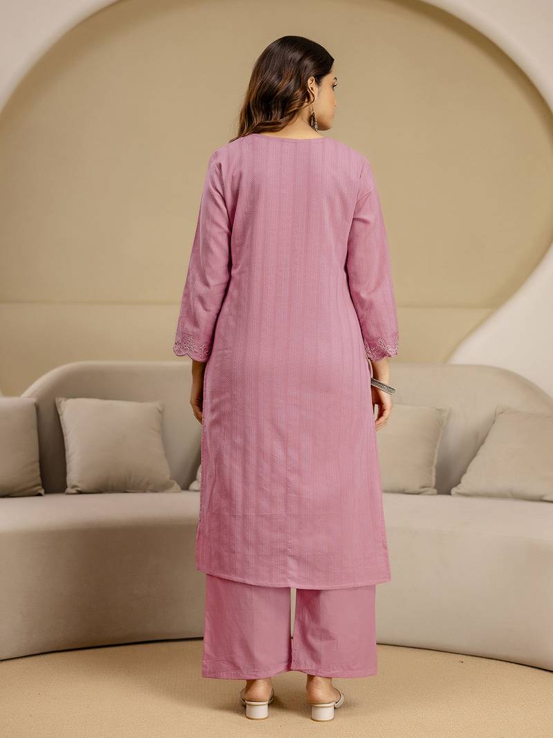 Light Pink Pure Cotton Embroidery Sequence Work Kurta Pant With Ethic Motifs Print Dupatta Set