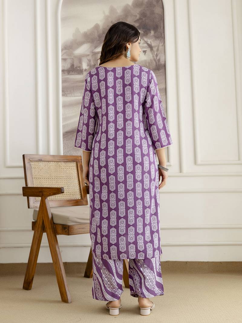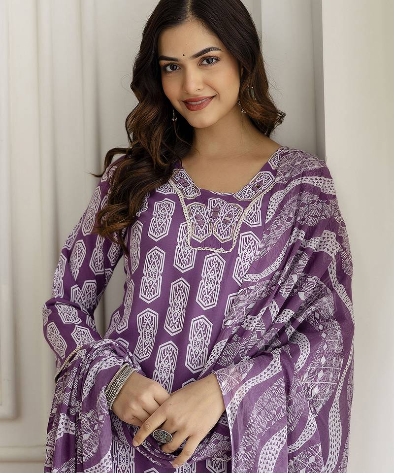 Purple Pure Cotton Embroidery Work Geometric Block Print Kurta Pant With Dupatta Set