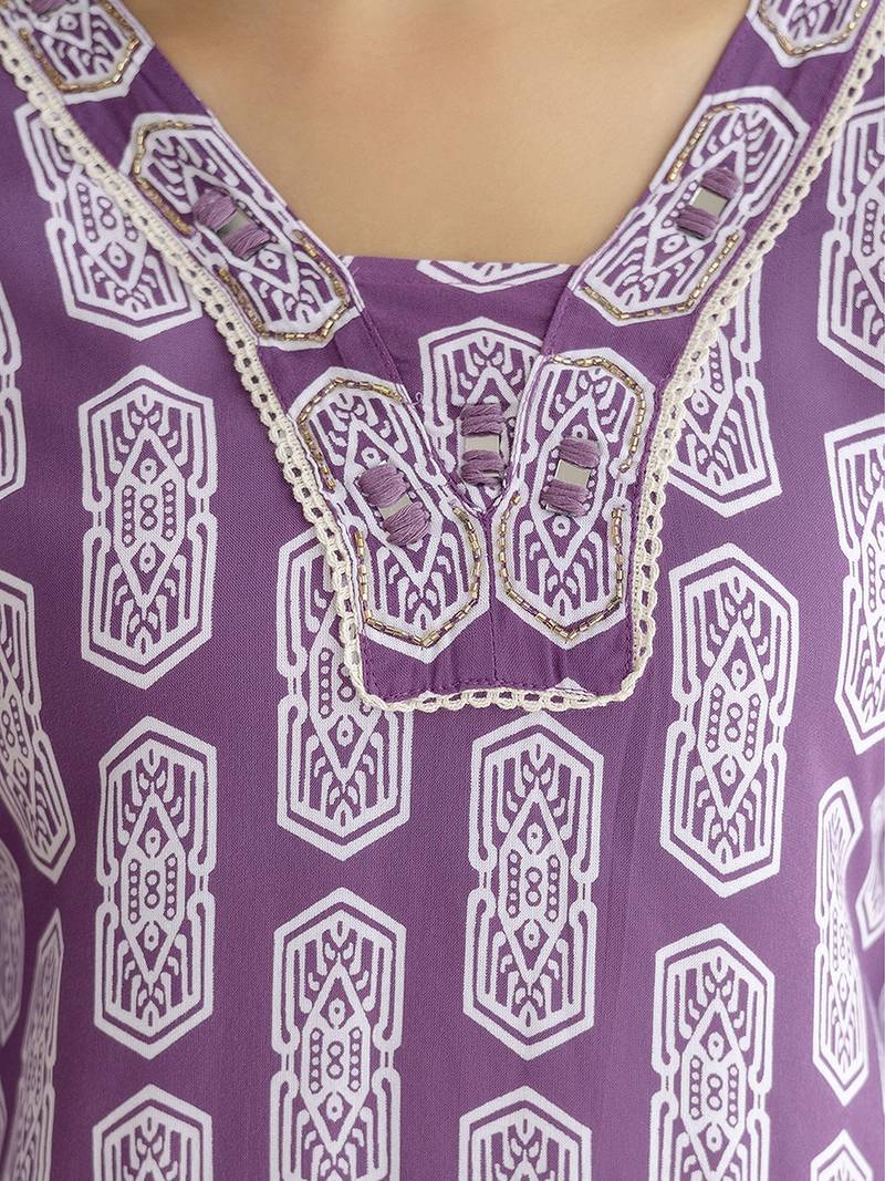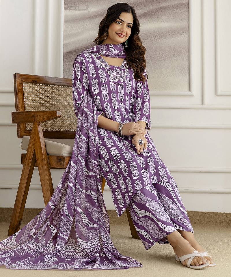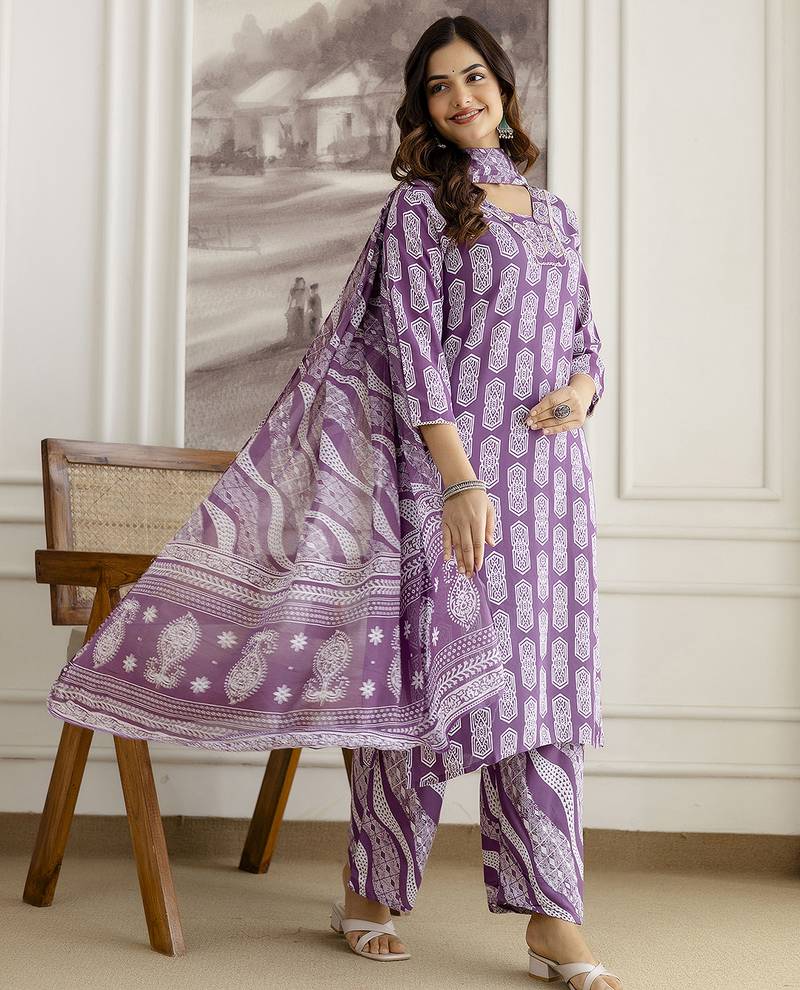 Purple pure cotton embroidery work geometric block print kurta pant with dupatta set stitched