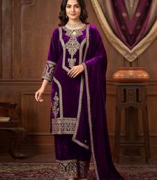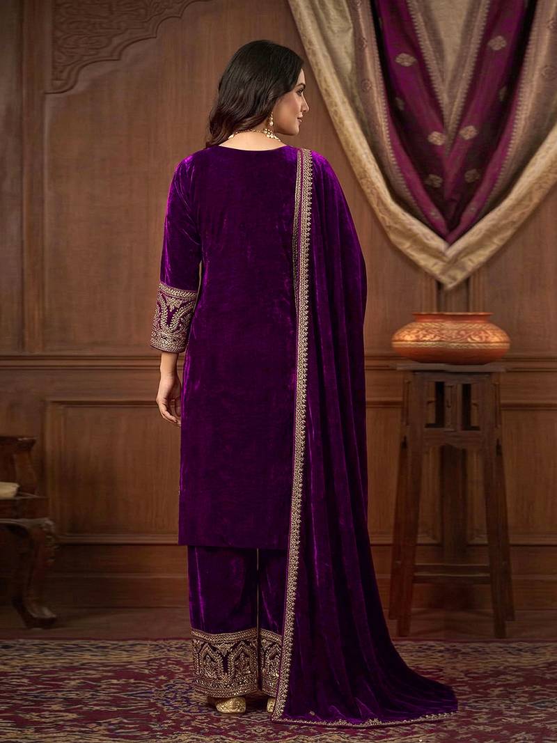 Purple velvet embroidery sequence work kurta pant with dupatta for women stitched