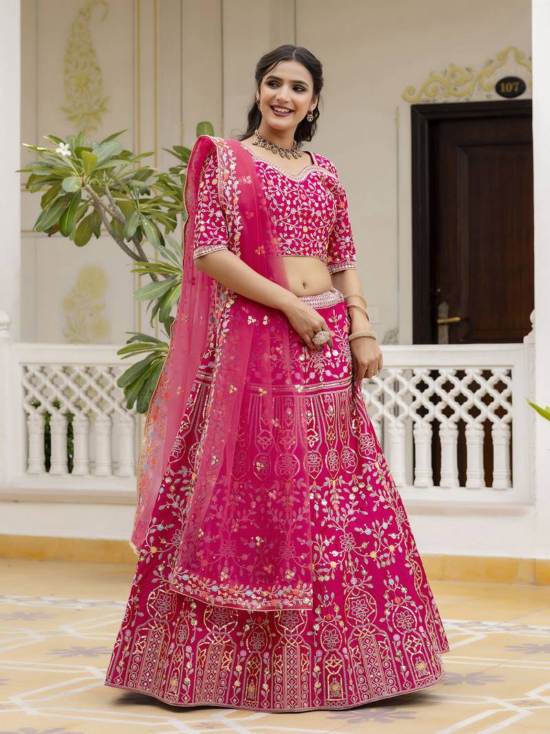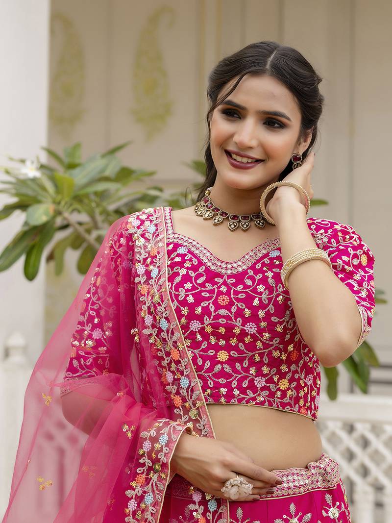 | Product Description | Shine Bright In This Dazzling Pink Lehenga Choli. This Semi Stitched Ensemble Is Crafted From Luxurious Satin Fabric, Providing A Beautiful Sheen And Elegant Drape For The Lehenga And Choli, Complemented By A Sheer Matching Dupatta. The Outfit Is Lavishly Embellished With Intricate Sequin Work, Thread Embroidery, And Metallic Accents. The Embroidery Forms Dense Floral, Paisley, And Geometric Patterns Throughout The Vibrant Pink Fabric And Along The Detailed Border. The Set Includes A Choli Piece That Can Be Tailored With A Flattering Neckline And A Sheer Pink Dupatta Featuring Scattered Sequins And A Matching Embellished Border With Dangling Tassels. Perfect For Festive Occasions, Weddings, And Parties, This Pink Lehenga Choli Set Allows For A Personalized Fit And Offers A Breathtaking Blend Of Rich Fabric, Intricate Work, And Vibrant Color For A Truly Memorable Appearance Once Tailored. |