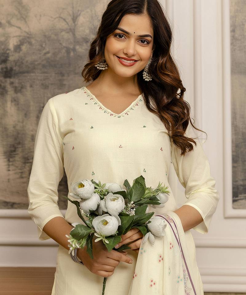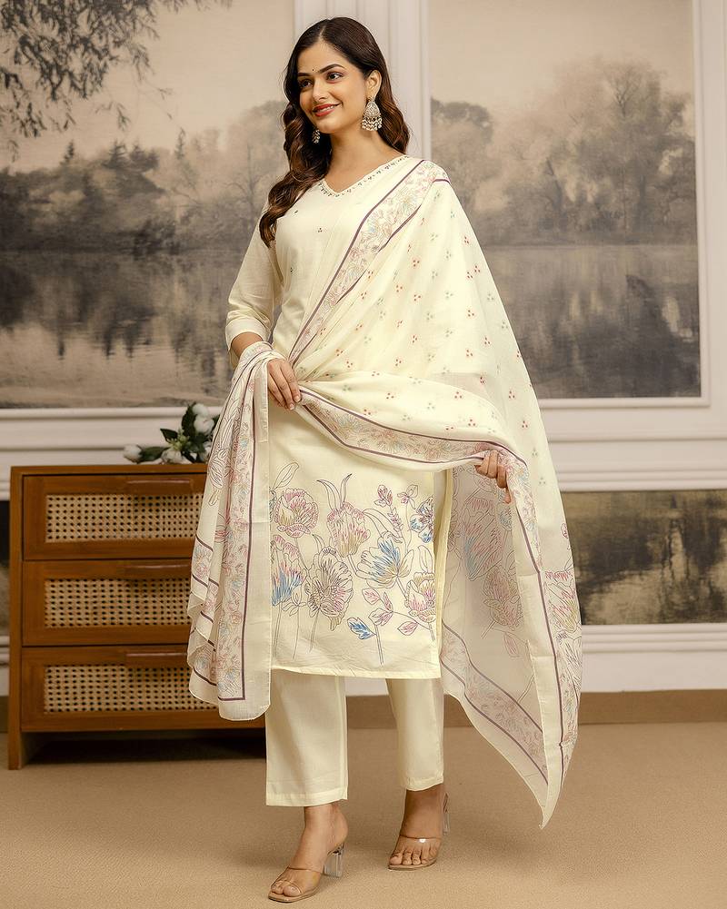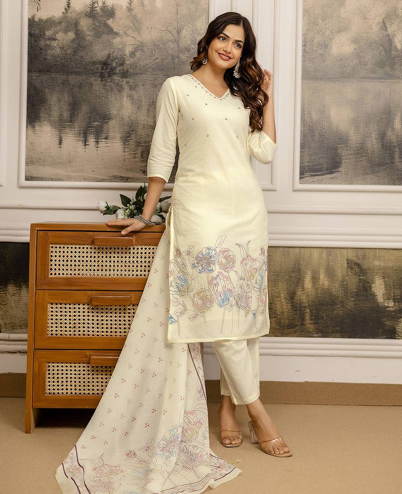 Style: Kurta Pant Dupatta Set || Work: Beads Work Embroidery With Floral Print