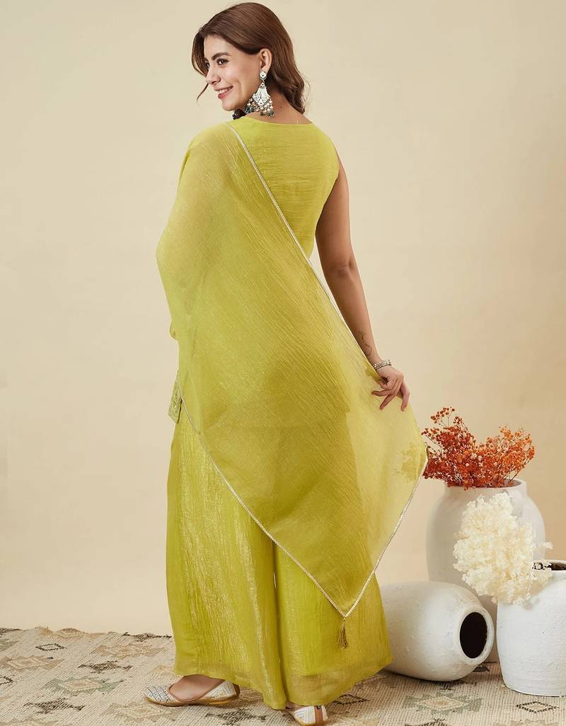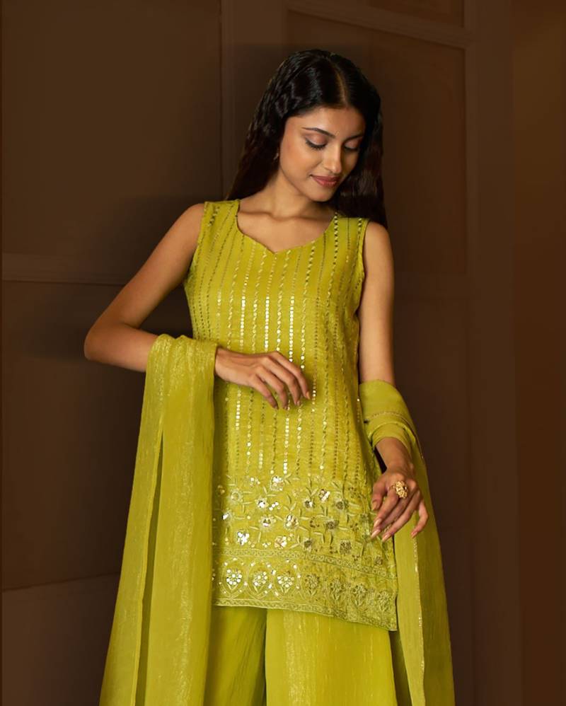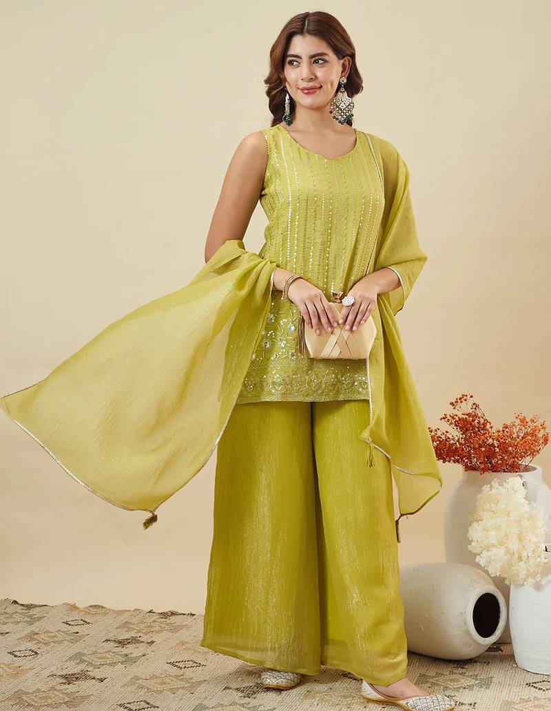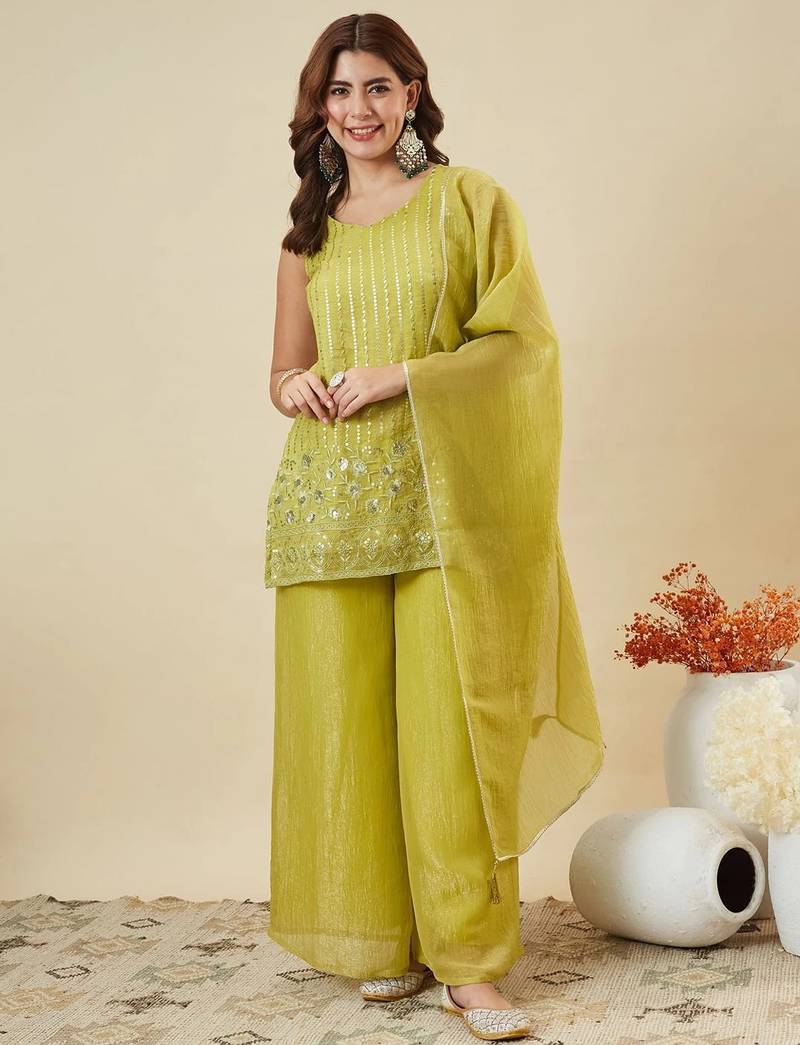 | Product Description | Elevate Your Festive Wardrobe With This Elegant Short Kurta Palazzo Set Crafted In Rich Crunchy Silk Fabric, Offering A Subtle Sheen And Premium Finish. The Kurta Features Intricate Thread And Sequin Work Arranged In Vertical Patterns With A Beautifully Detailed Embroidered Hem, Adding A Refined Designer Touch. Paired With Flowy Wide Leg Palazzo Pants, The Set Ensures Both Comfort And A Graceful Silhouette. The Lightweight Dupatta With Delicate Borders Completes The Look, Making It Perfect For Festive, Party, And Occasion Wear.Kurta Palazzo Set, Short Kurta Set, Festive Wear Kurta Set, Party Wear Kurta Set, Silk Fabric Kurta Set, Silk Kurta Set, Designer Kurta Set, Trendy Kurta Set, Palazzo Suit Set, Traditional Wear, Stylish Kurta Set, Latest Kurta Design. |