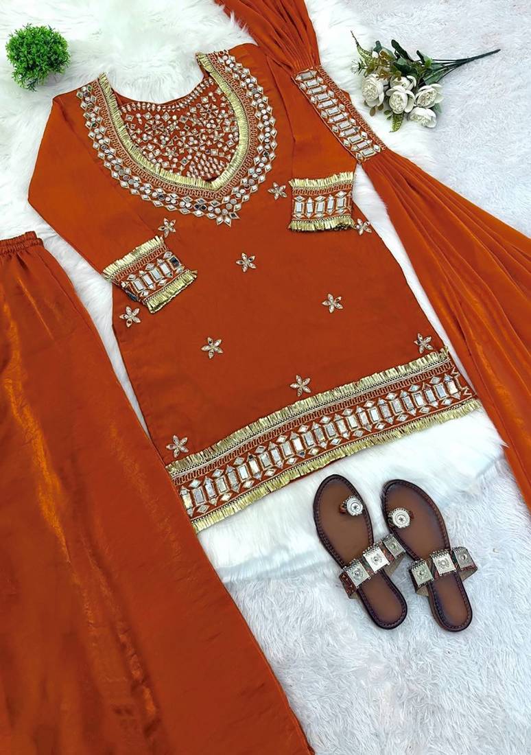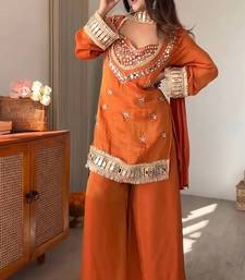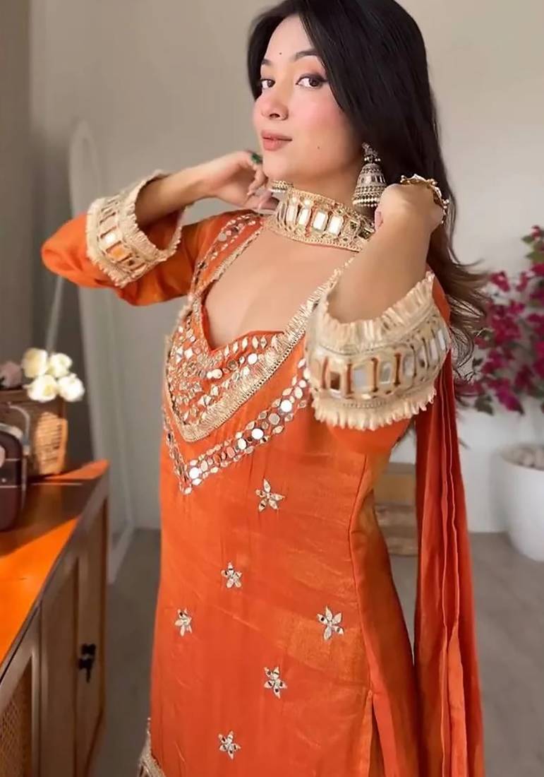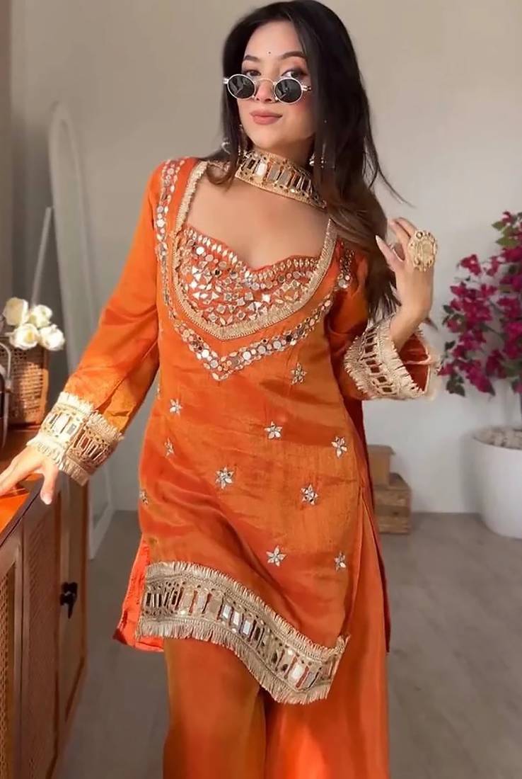 | Product Description | This Stylish Women’s 3 Piece Set Includes A Kurta, Palazzo, And Dupatta, Crafted From Premium Fandy Silk Fabric. This Set Feature Intricate Mirror Work With Heavy Embroidered Neckline And Statement Lace Detailing On Sleeves And Hem, Giving A Bold Festive Appeal. The Straight Fit Kurta Layered Over The Crop Top Adds A Trendy Fusion Look, Paired With Flowy Palazzo Pants For A Comfortable Yet Elegant Silhouette. Completed With A Matching Dupatta, This Ensemble Stands Out With Its Vibrant Color And Designer Pattern, Perfect For Festive Wear, Party Wear, And Wedding Occasions. Women Crop Top Kurta Palazzo Set, Festive Wear Kurta Set, Party Wear Ethnic Outfit, Silk Fabric Kurta Set, Shimmer Fabric Designer Suit, Pakistani Style Kurta Palazzo, Designer Crop Top Set, Trendy Kurta Palazzo Set, Wedding Festive Wear Dress, Mirror Work Kurta Set, Embroidered Designer Set, Ethnic Party Wear Outfit, Fusion Ethnic Wear For Women, Girls Trendy Festive Set |