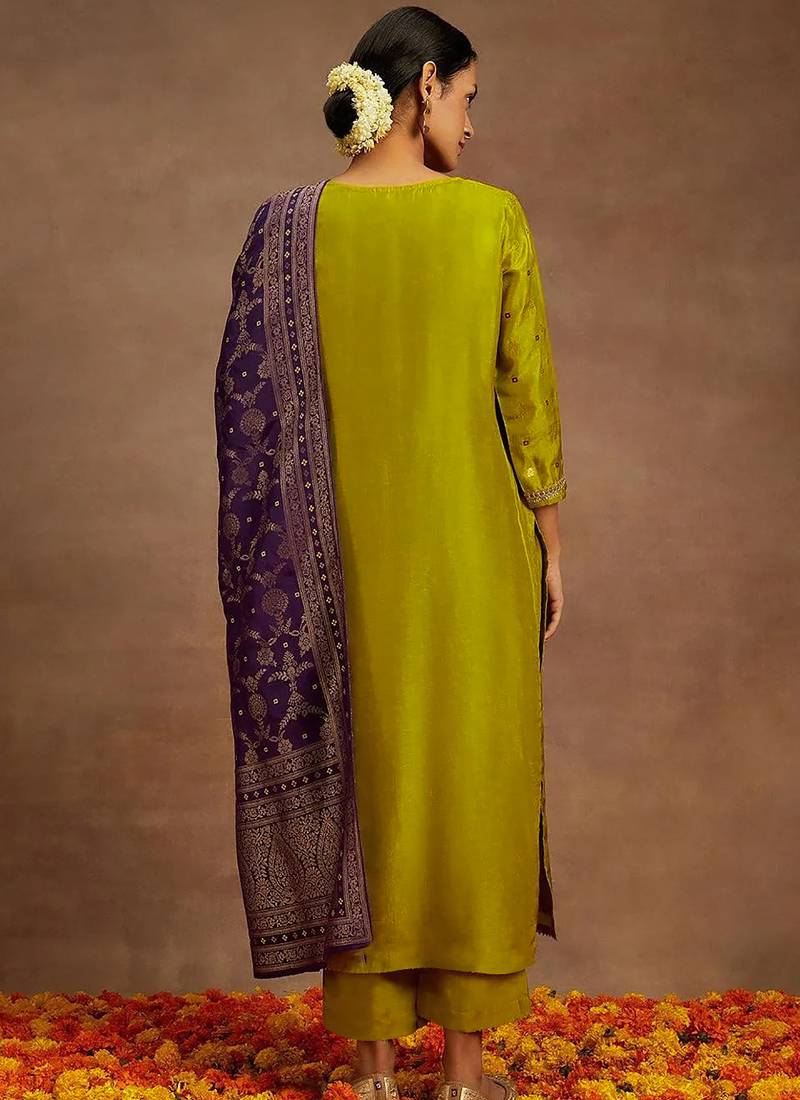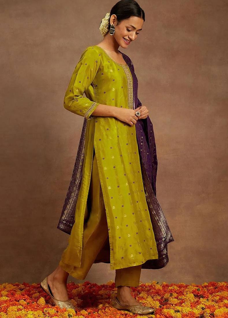| Product Description | This Elegant Women’s Kurta Pant With Dupatta Set Is Crafted In Rich Art Silk, Offering A Smooth Sheen And Festive Appeal. The Kurta Features Delicate Woven Motifs With A Neatly Detailed Neckline, Giving It A Refined Traditional Look. The Contrasting Dupatta Is Beautifully Adorned With Intricate Ethnic Patterns And An Ornate Border That Enhances The Overall Grace. Paired With Solid Straight Fit Pants, This Set Creates A Balanced And Classy Appearance. |