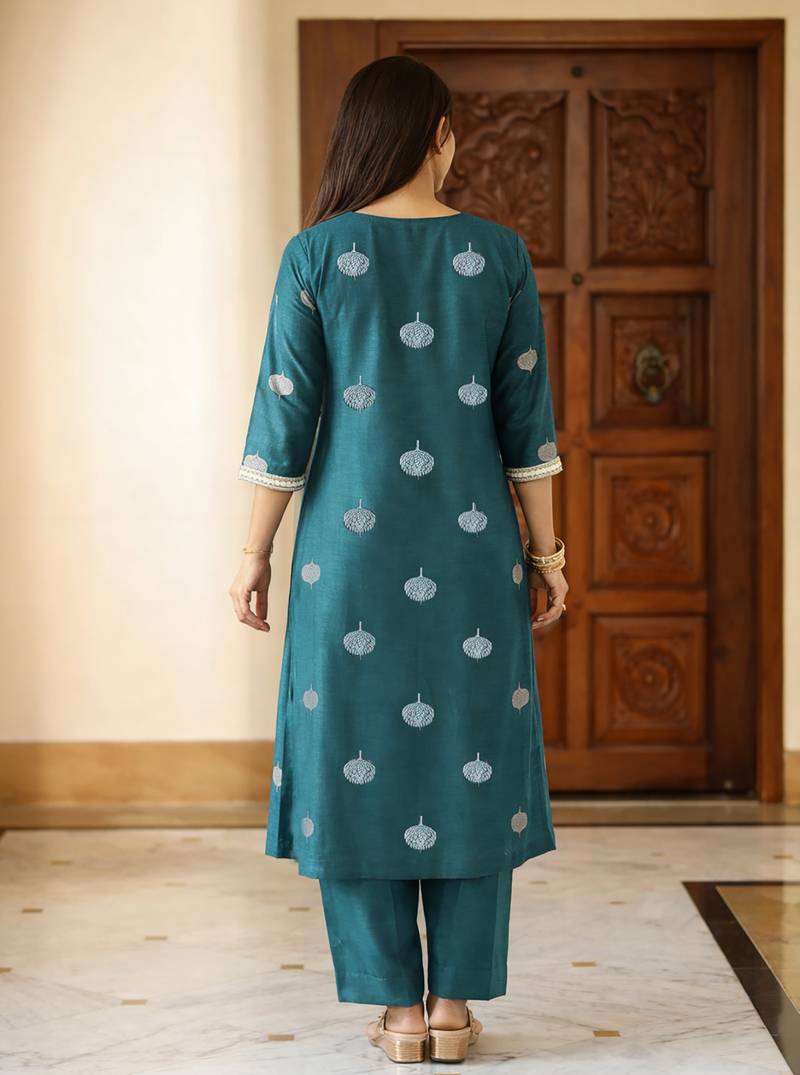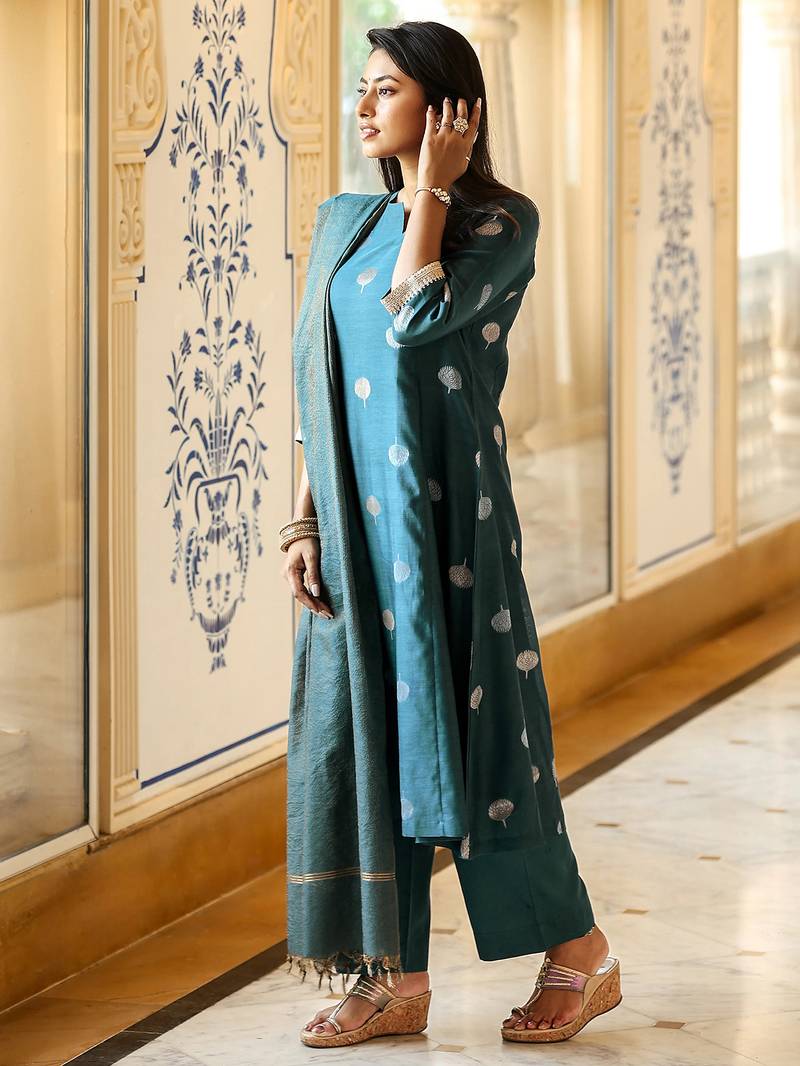 | Product Description | Elevate Your Ethnic Wardrobe With This Elegant Kurta Pant Set Crafted In Rich Art Silk Jacquard, Offering A Subtle Sheen And Premium Feel. The Kurta Features Woven Jacquard Buta Motifs All Over, Giving It A Graceful Traditional Appeal Without Heavy Embroidery. Paired With A Solid Matching Pant And A Lightweight Jacquard Dupatta With Delicate Borders, This Set Looks Refined And Balanced. The Overall Appearance Is Classy, Minimal, And Festive, Perfect For Office Wear, Family Gatherings. |