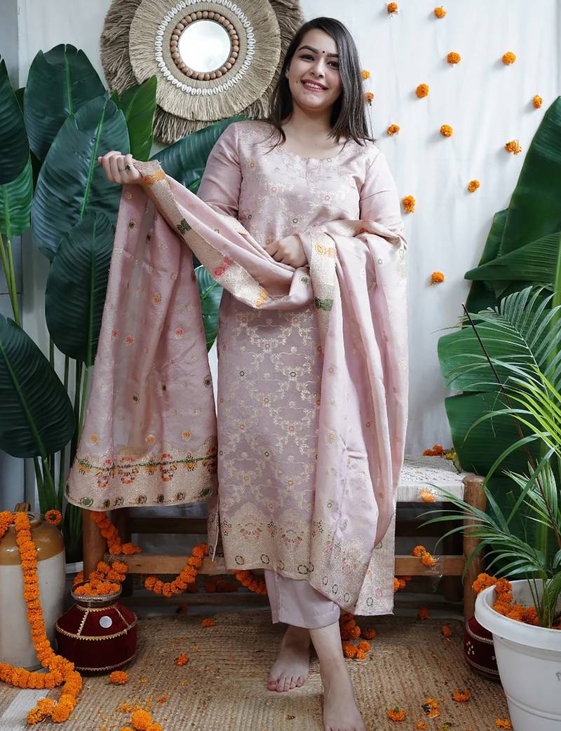 | Product Description | Elevate Your Festive Look With This Elegant Art Silk Kurta Pant With Dupatta Set Featuring Intricate Thread And Zari Embroidery That Adds A Touch Of Traditional Grace. The Soft Pastel Tone Enhances Its Rich Woven Pattern, Making It Perfect For Celebrations And Ethnic Gatherings. The Matching Pant Ensures A Comfortable Yet Stylish Fit, While The Dupatta Adorned With Delicate Embroidered Motifs And A Woven Border Completes The Sophisticated Look. Ideal For Festive Wear, Parties, Or Cultural Events, This Outfit Beautifully Blends Tradition With Timeless Charm. |