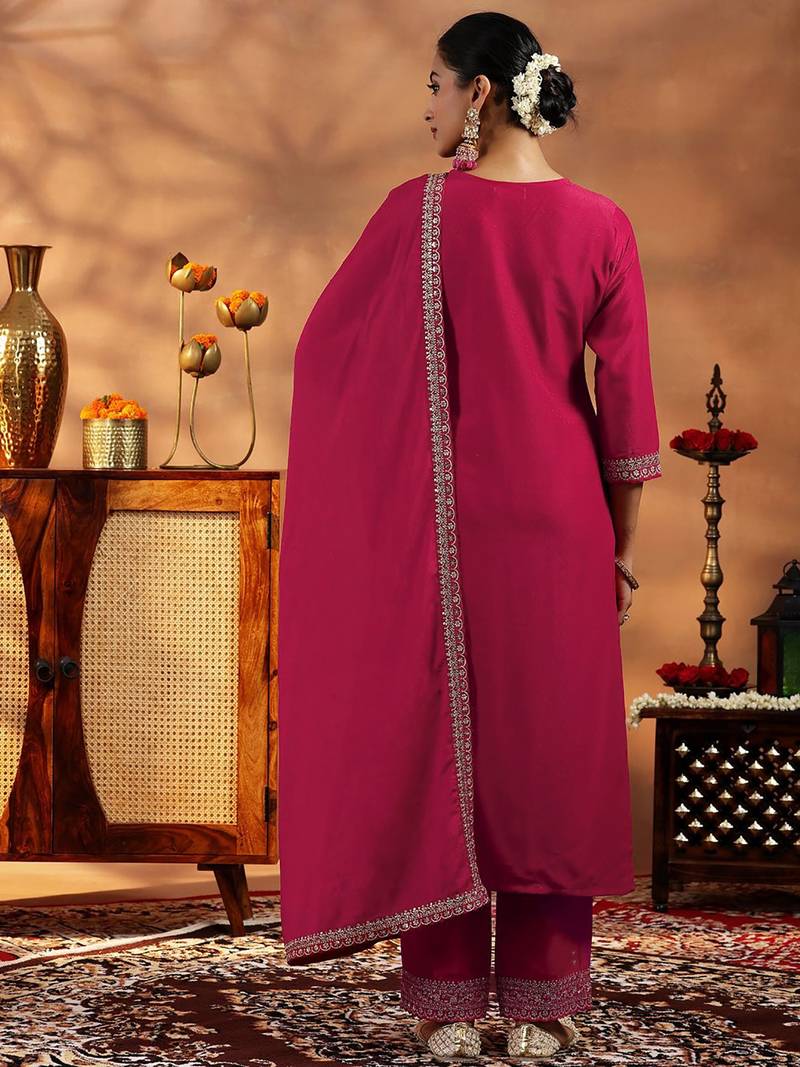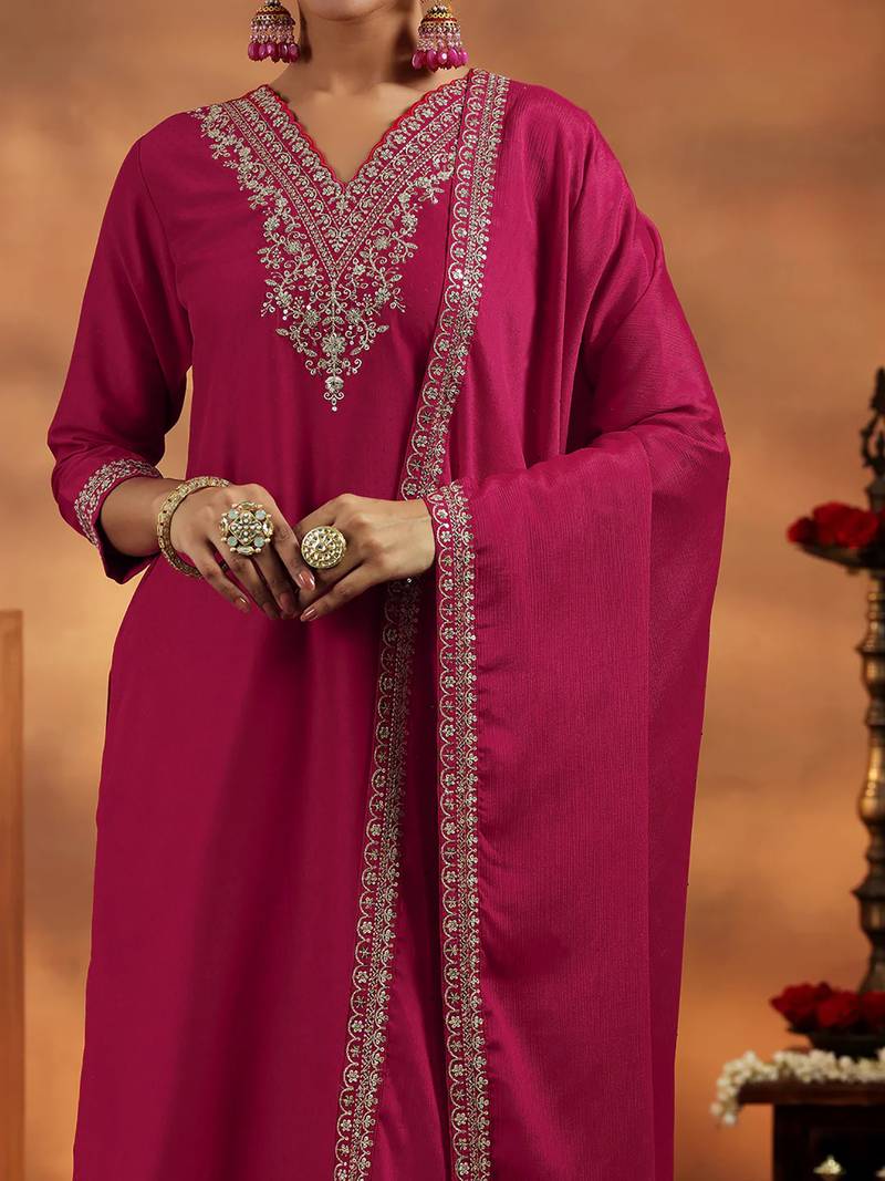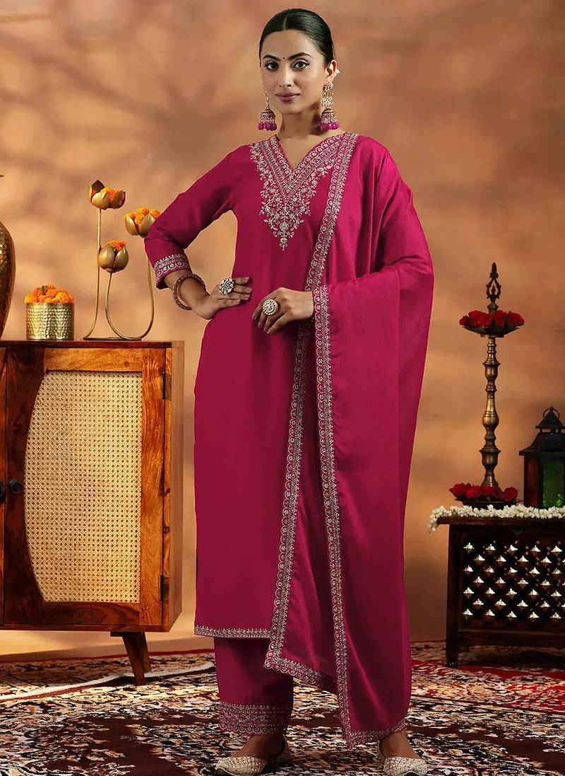 | Product Description | Elevate Your Festive Style With This Elegant Women’s Kurta Pant With Dupatta Set Crafted In A Rich Silk Blend Fabric. The Kurta Features Intricate Embroidery Work Along The Neckline, Sleeves, And Borders, Adding A Refined And Graceful Touch. Paired With A Matching Straight Fit Pant And A Beautifully Finished Dupatta With Detailed Embroidered Edging, The Set Looks Perfectly Coordinated. The Smooth Texture, Subtle Sheen, And Classic Solid Pattern Enhance Its Royal Appearance, Making It Ideal For Festive Occasions, Weddings, And Evening Gatherings. |