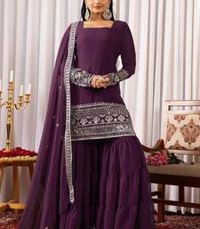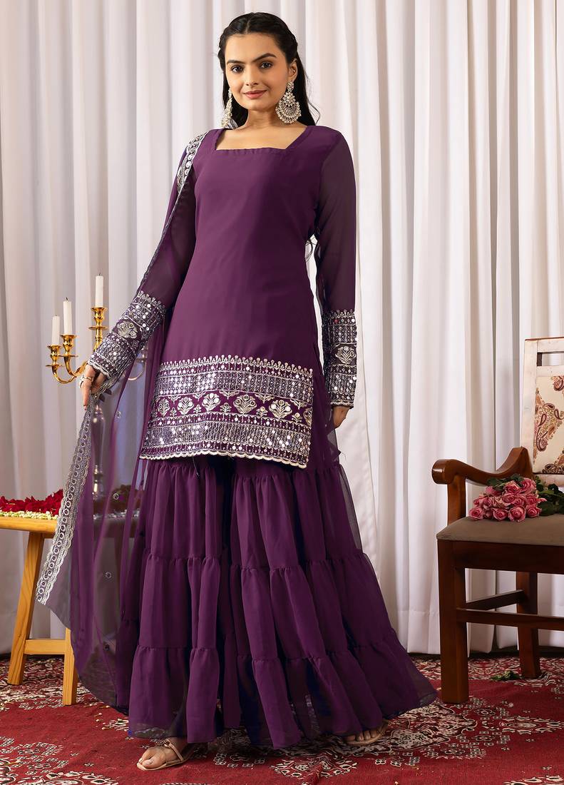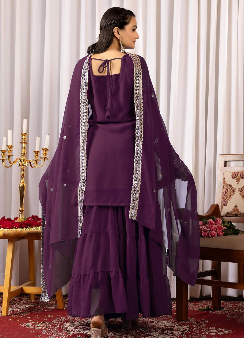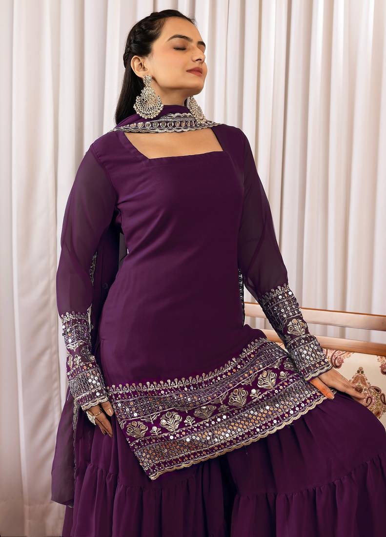 | Product Description | Elevate Your Ethnic Charm With This Stunning Georgette Kurta Sharara With Dupatta Set, Designed In A Rich Dark Purple Shade. The Kurta Features A Stylish Square Neckline With Sheer Long Sleeves, Beautifully Highlighted With Intricate Zari And Mirror Embroidery On The Cuffs And Hemline. The Flowy Layered Sharara Adds Grace And Volume, Making It Perfect For Festive And Wedding Occasions. |