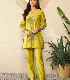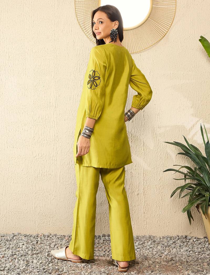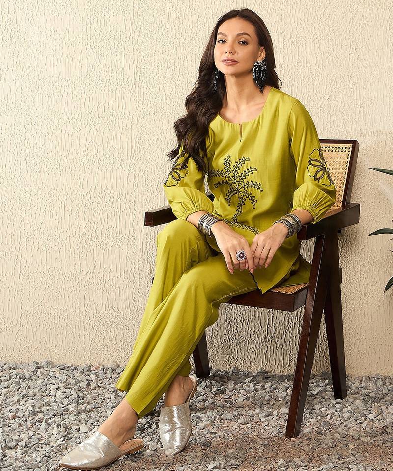 | Product Description | Elevate Your Everyday Style With This Elegant Silk Blend Kurta Pant Set, Designed For Comfort And Chic Appeal. The Kurta Features Beautiful Nature Inspired Embroidery With Leafy And Floral Motifs For A Modern Ethnic Touch. Its Scalloped Hem And Stylish Puff Sleeves Add A Refined, Trendy Look. Paired With Matching Straight Fit Pants, This Set Offers A Fresh, Vibrant Appearance Perfect For Casual Outings Or Festive Gatherings. |