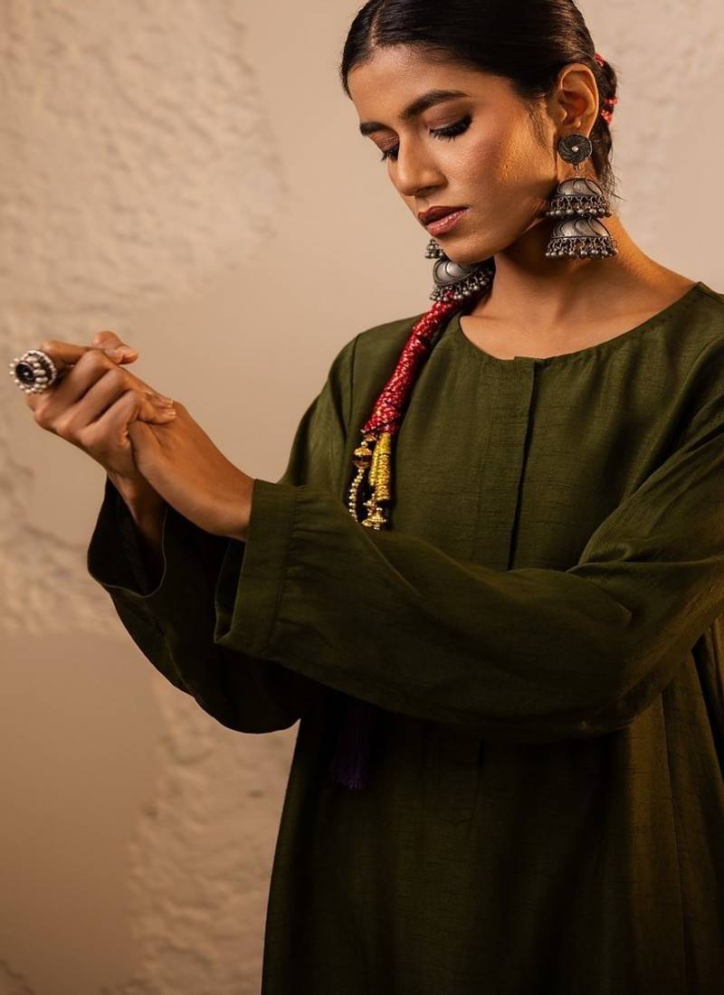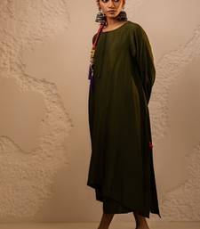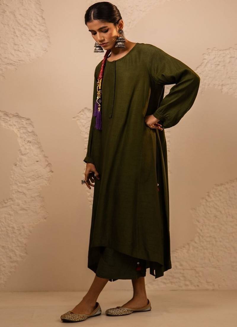 Product Description | Top: Mehendi Green Flowy Loose Fit A Line Kurta With Bracelet Gathered Sleeves Bottom: Mehendi Green Loose Style Pants