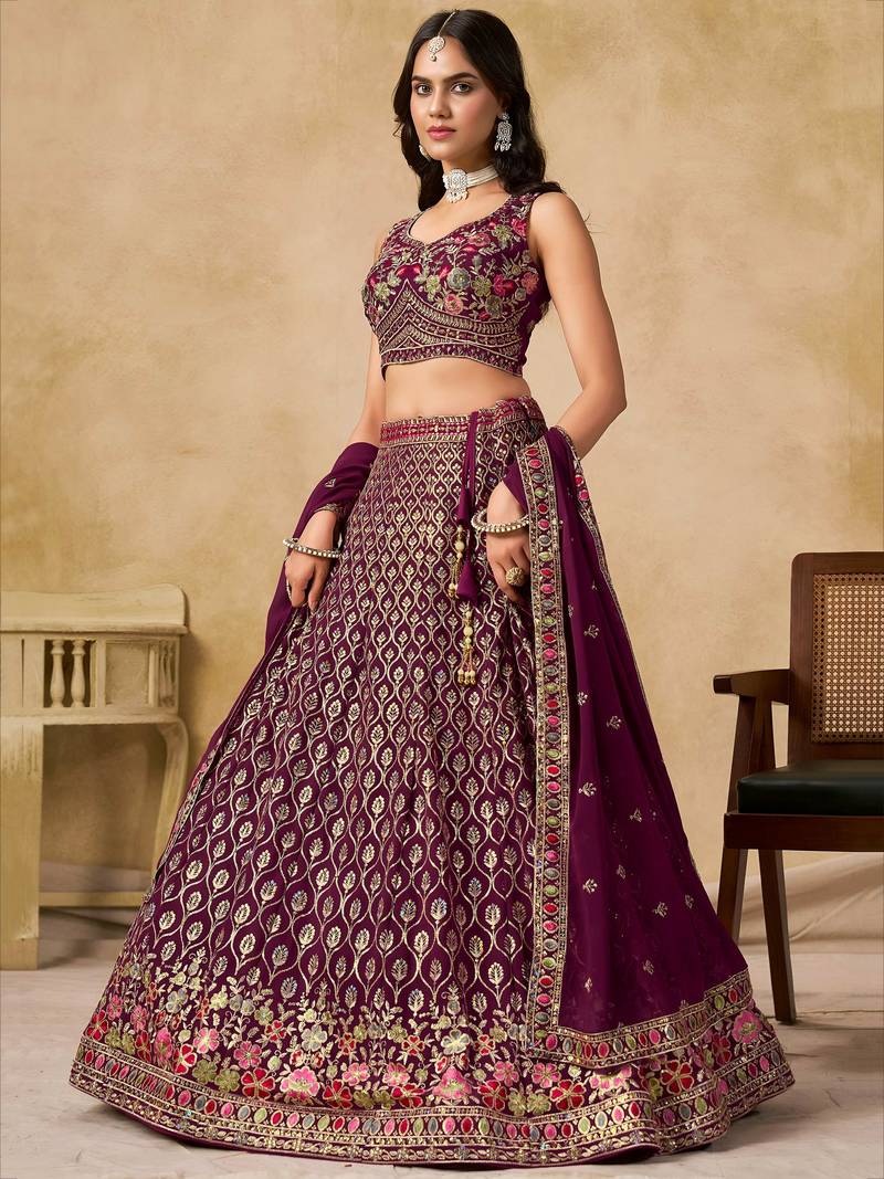 | Product Description | This Elegant Maroon Lehenga Is Crafted From Rich Georgette Fabric, Featuring Intricate Sequins And Zari Embroidered Work. The Detailed Floral Border And Shimmering Motifs Offer A Luxurious And Festive Look For Grand Celebrations.
