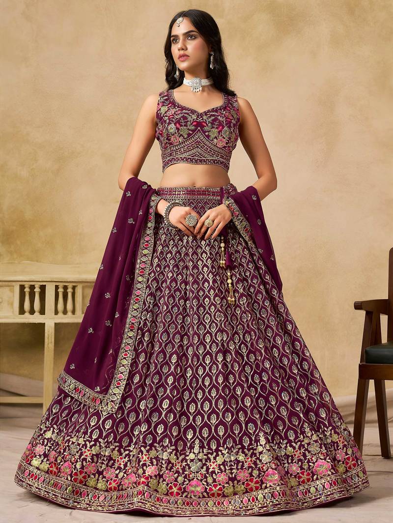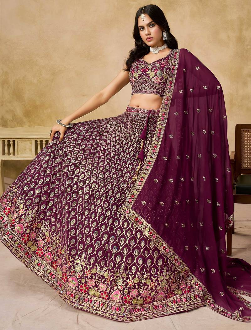 | Product Description | This Stunning Wedding Lehenga Comes In A Rich Purple Shade Crafted From Premium Georgette Fabric. It Features Exquisite Sequins And Zari Embroidered Motifs That Add Regal Elegance To The Overall Look.