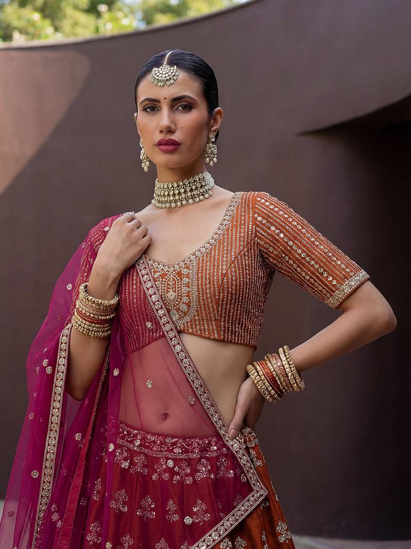 | Product Description | This Lehenga Features A Rich Burnt Orange Silk Lehenga Base Paired With Elegant Antique Gold Zari Work, Creating A Bold And Traditional Appeal. The Intricate Motifs Are Highlighted With Tones Of Rust, Copper, And Subtle Golden Hues, Giving The Outfit A Warm And Radiant Finish.