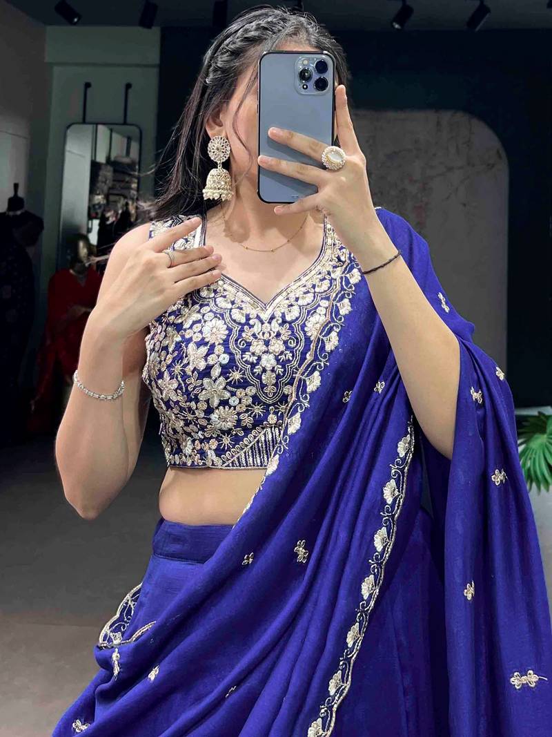 | Product Description | The Stitched Lehenga Comes In A Rich Royal Blue Silk Fabric, Giving A Smooth And Elegant Shine. It Supports A Waist Up To 42 Inches With A Drawstring And Zip Closure, And Features A 41 Inch Length With A 5 Meter Flair And Canvas For A Structured Look.