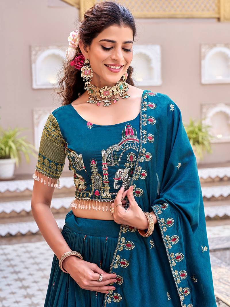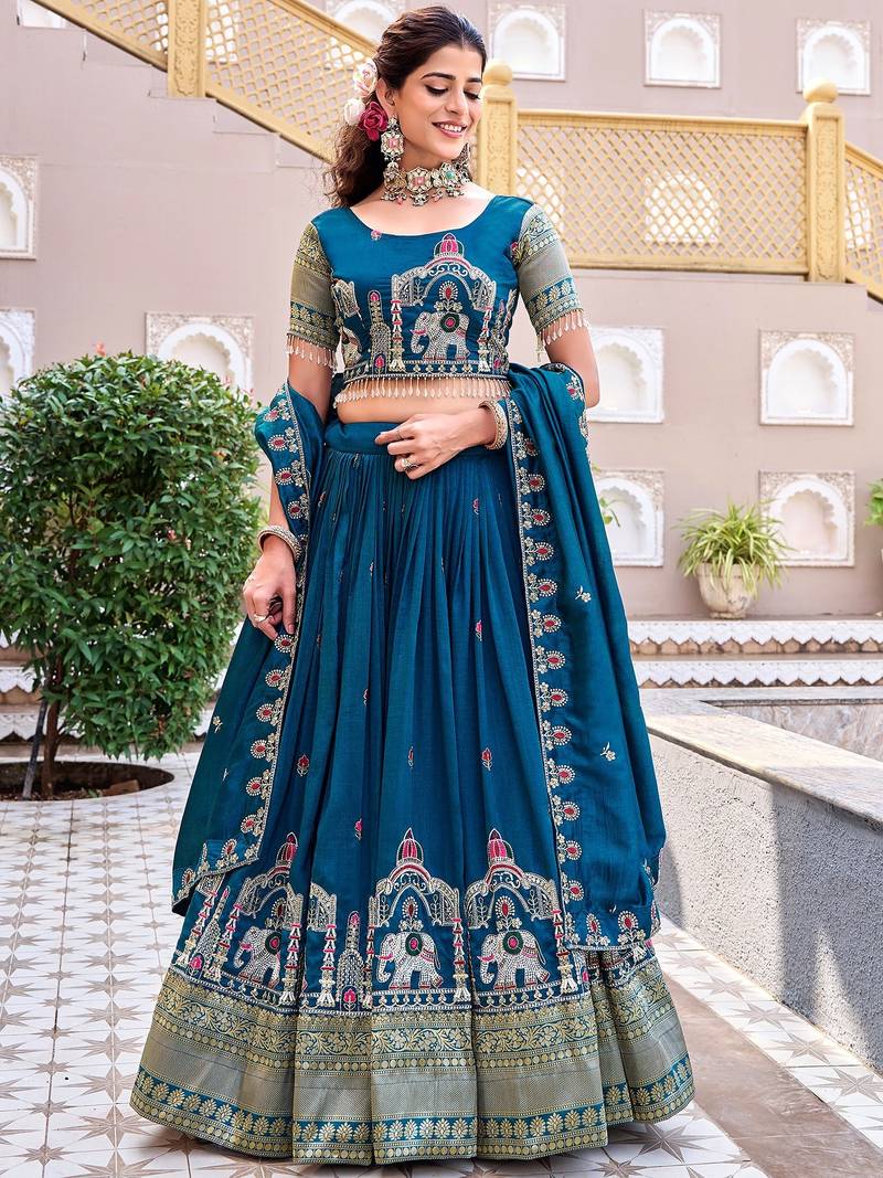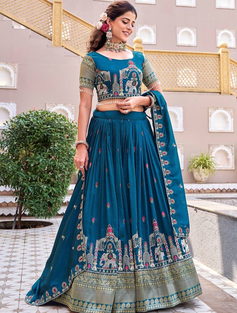 | Product Description | This Beautiful Lehenga Choli Set Is Made From Vichitra Silk Fabric With Heavy Embroidery, Sequins, Zari Weaving And Thread Work. The Choli Comes Fully Stitched With Elegant Readymade Lace For A Rich Festive Look.