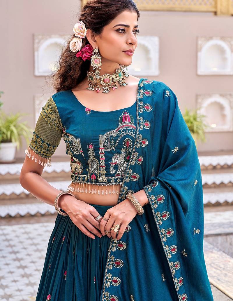 Beautiful blue thread embroidered silk wedding lehenga choli