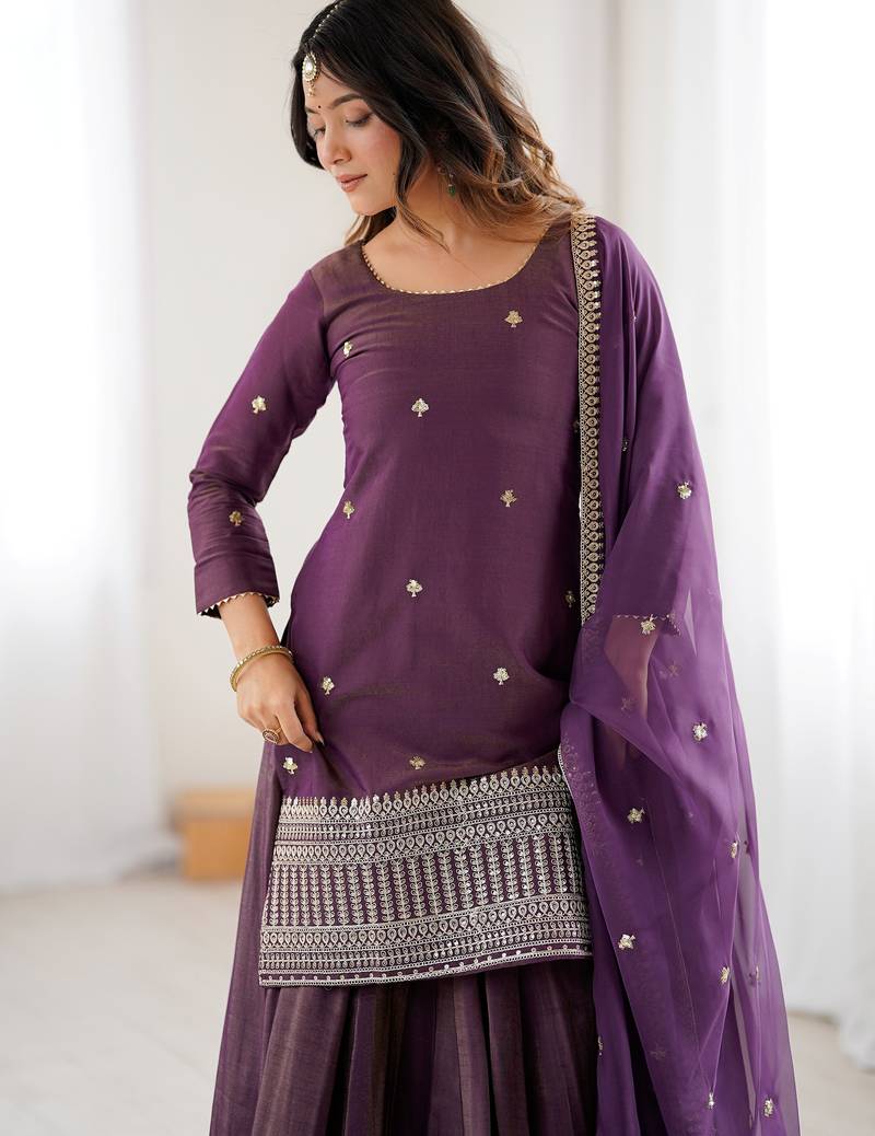 Bewitching purple zari work silk designer lehenga with kurti stitched