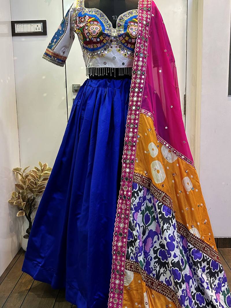 Blue mirror work silk navratri lehenga set choli with dupatta with dupatta