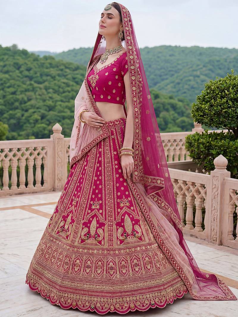 The Lehenga Is Crafted From Rich Rani Pink Silk Fabric With Beautiful Gold Dori Embroidery And Peacock Figure Motifs. The Design Is Enhanced With Multi Thread Work, Zari, And Diamond Detailing In Gold With Subtle Green And Mustard Accents. It Comes With Standard Cancan And Canvas Attached.