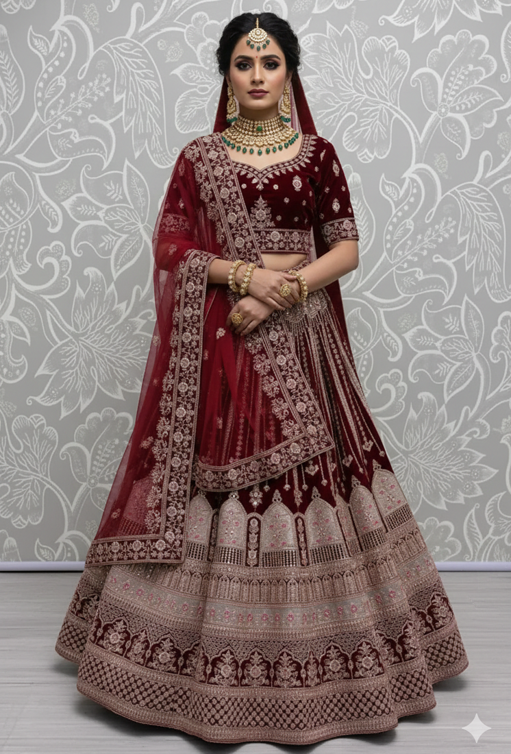 | Product Name | Dark Maroon Velvet Bridal Lehenga Set Choli With Dupatta With Dupatta | |