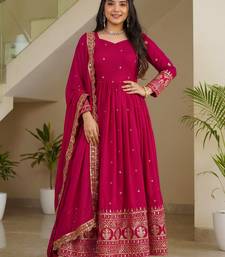 This Stitched Gown Comes In A Rich Magenta Tone, Crafted From Premium Vichitra Silk That Gives A Graceful Flow And Festive Elegance.