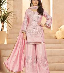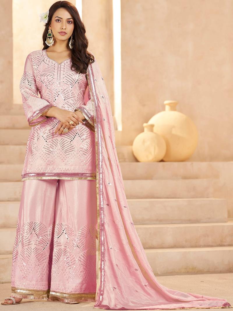 | Product Name | Elegant Pink Mirror Work Chinon Reception Wear Palazzo Suit | |
