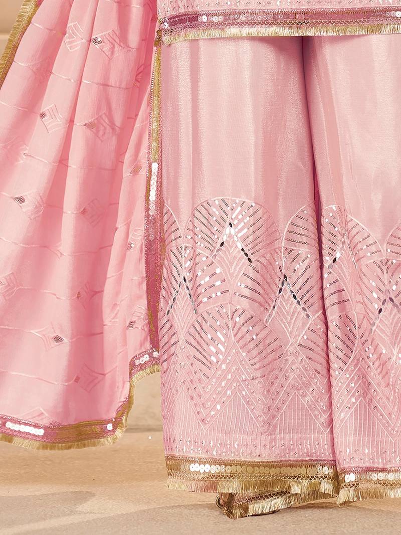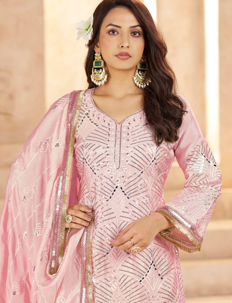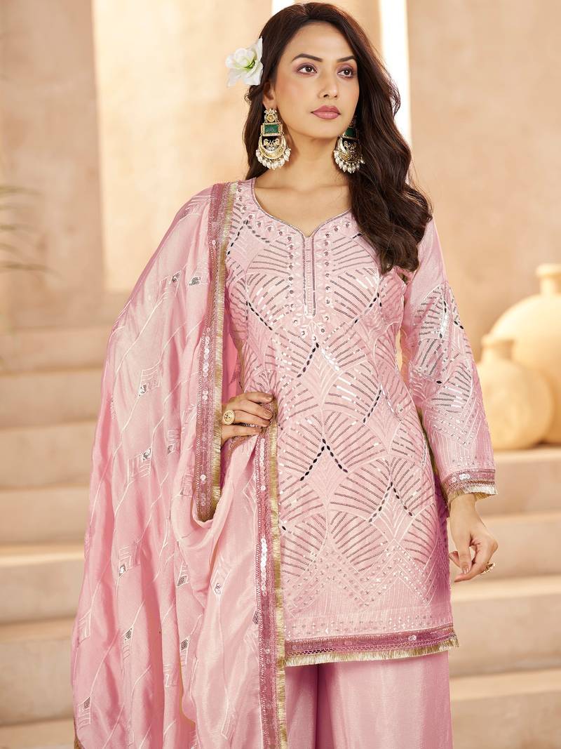Elegant pink mirror work chinon reception wear palazzo suit stitched