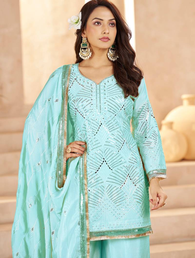 Enchanting sky-blue mirror work chinon traditional palazzo suit stitched