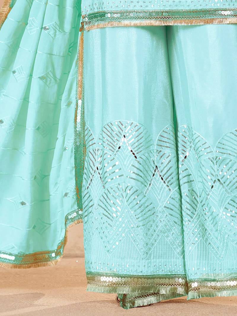 This Refreshing Sky Blue&Nbsp;Suit Set Is Crafted From Chinon Fabric For The Kurti, Palazzo, And Dupatta, Offering A Soft Texture And Graceful Flow.