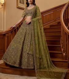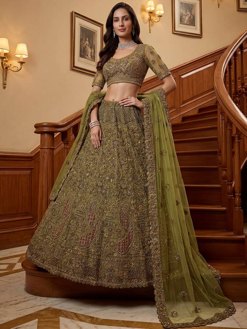 Excellent olive green sequins net bridal lehenga choli with dupatta