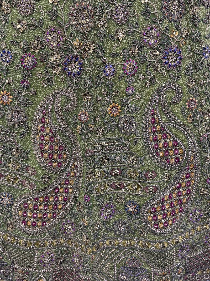 | Product Description | This Elegant Olive Green Bridal Lehenga With Antique Gold Detailing Features Rich Embroidery In Tones Of Maroon, Bronze, And Muted Gold With A Soft Shimmer. It Comes With Standard Stitching, Cancan And Canvas Attached, And A Grand 4+ Meter Flair.