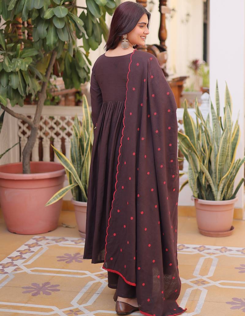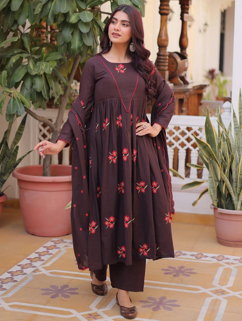 The Dupatta Carries A Matching Brown Base With Delicate Red Embroidered Motifs, Completing The Color Palette Of Brown, Red, And Hints Of Green. The Dupatta Length Is 2.25 Meters, Making It Ideal For Casual Outings, Festive Wear, Office Wear, And Small Gatherings.