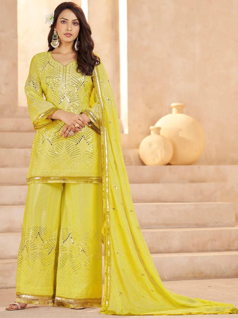 | Product Name | Fabulous Yellow Mirror Work Chinon Eid Special Palazzo Suit With Dupatta | |