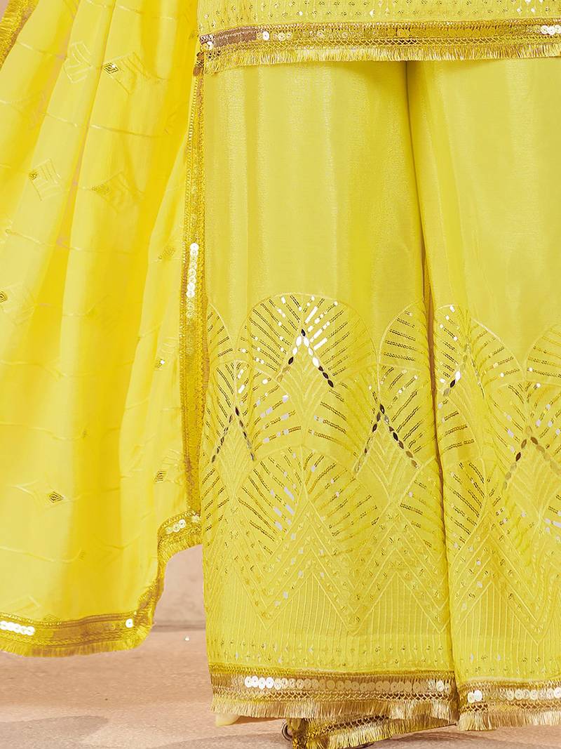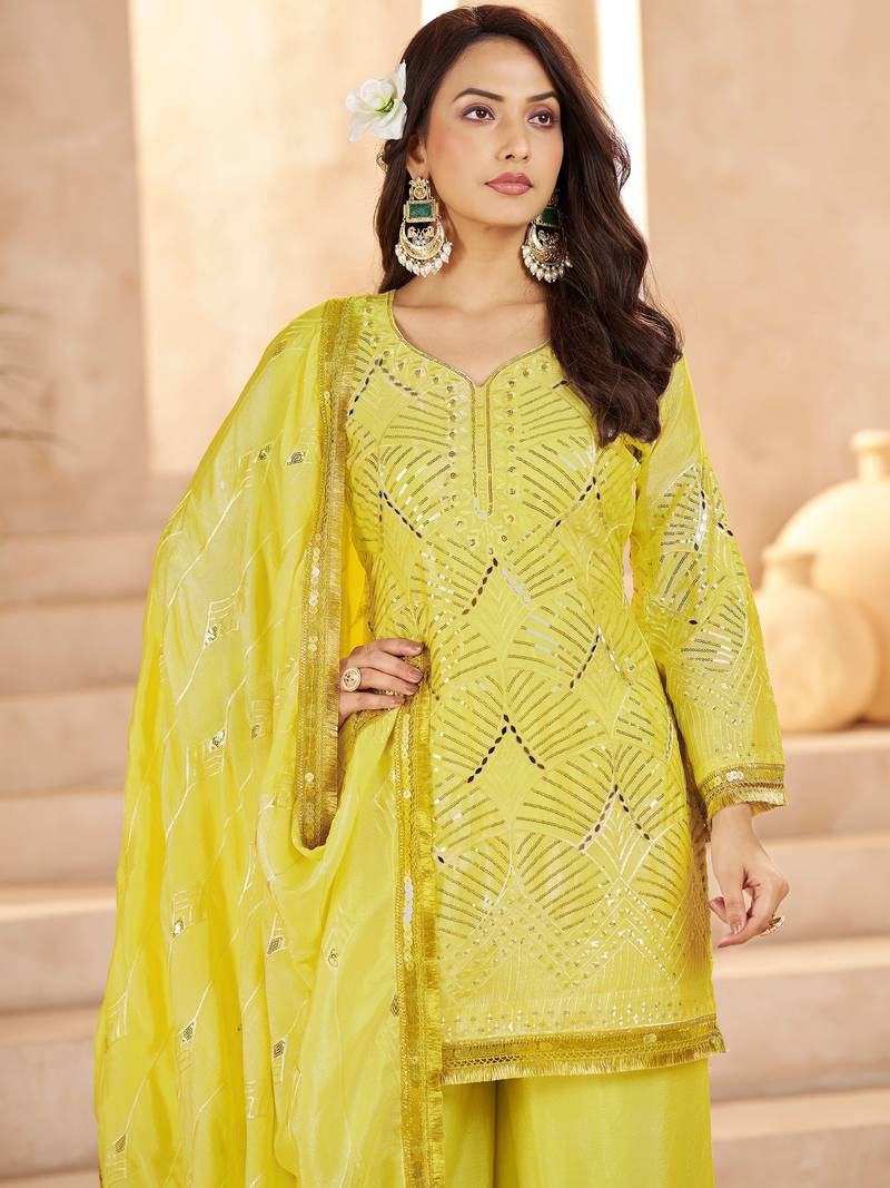 Fabulous yellow mirror work chinon eid special palazzo suit with dupatta stitched