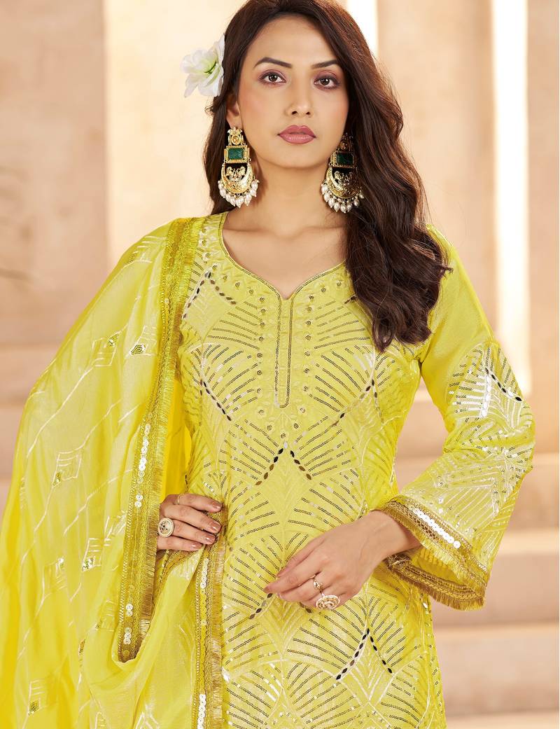 | Product Description | This Vibrant Yellow Suit Set Is Crafted From Premium Chinon Fabric For The Kurti, Palazzo, And Dupatta, Offering A Soft Texture With A Graceful Fall.