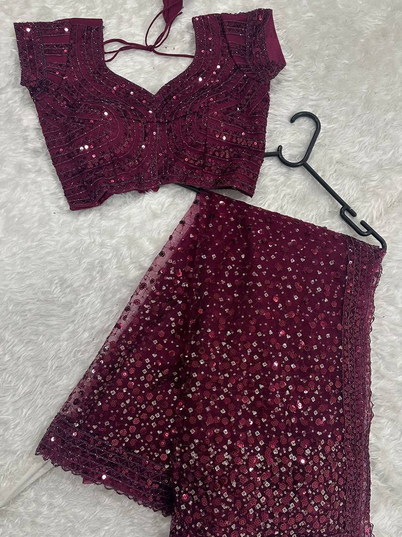 Glamourous wine sequins net festival wear saree with blouse