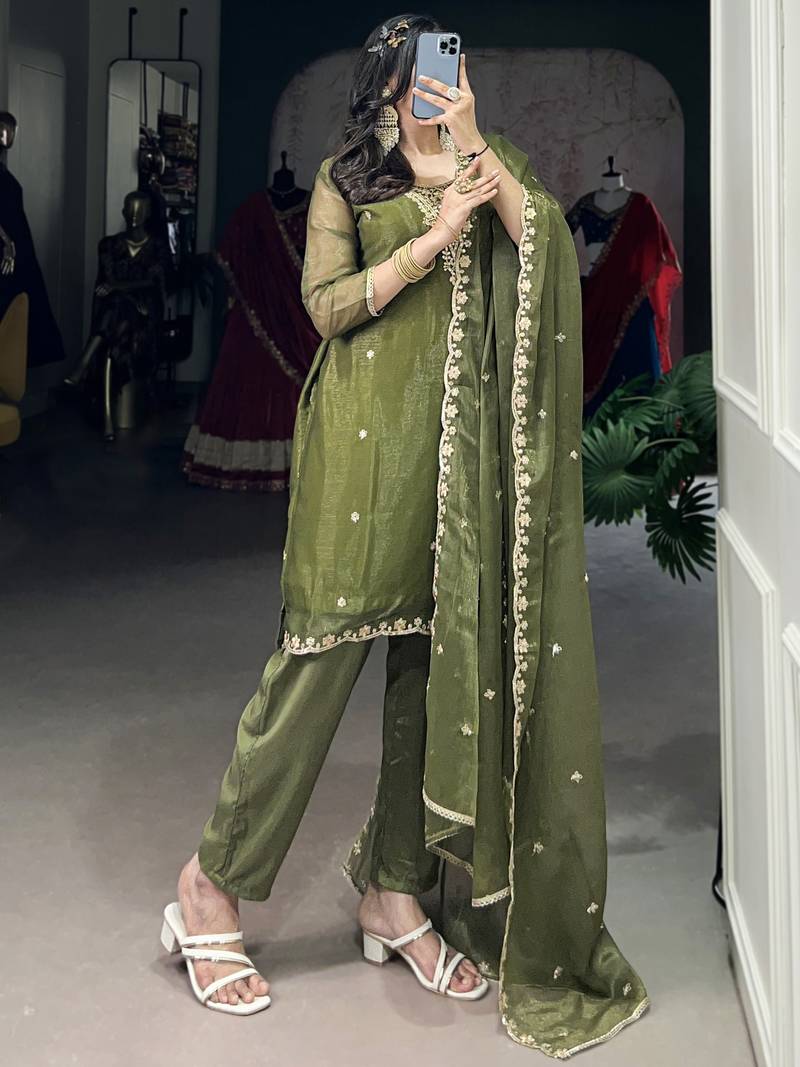 Incredible olive green sequins organza mehendi wear salwar suit stitched