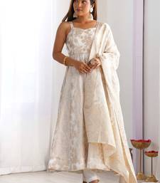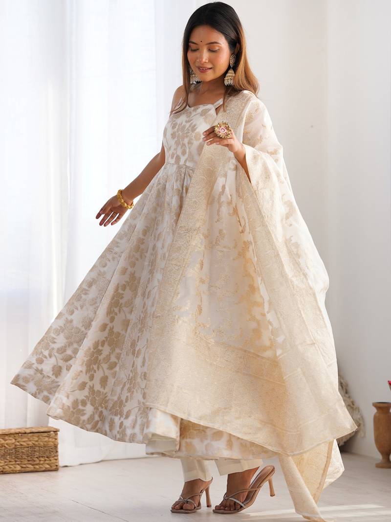 Magnificent off-white zari weaving silk festival wear anarakali suit stitched