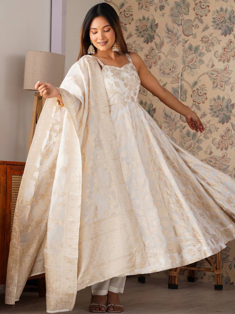 The Elegant Anarkali Gown Comes In A Graceful Off White Shade Highlighted With Subtle Gold Woven Motifs, Creating A Refined Festive Appeal. Crafted In Premium Silk Fabric, It Features A Fancy Backless Dori Pattern With Padded Support, Sleeve Fabric Attached Inside, And A Zipper Closure For A Flawless Fit.