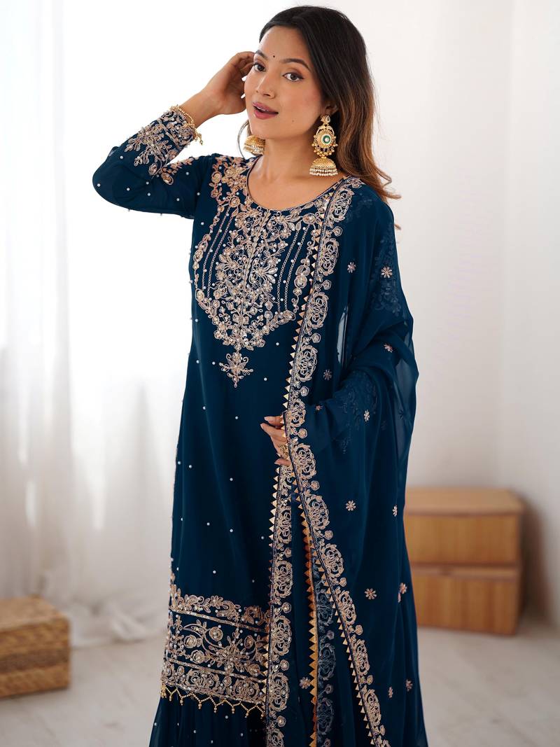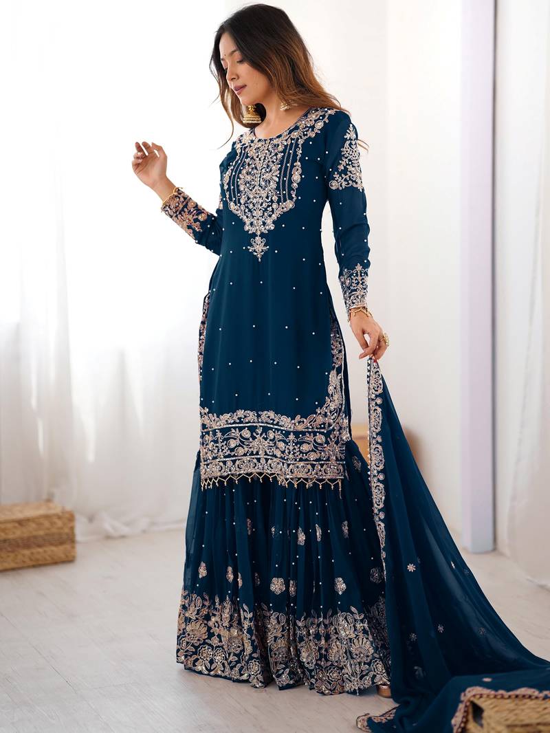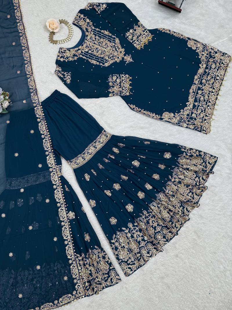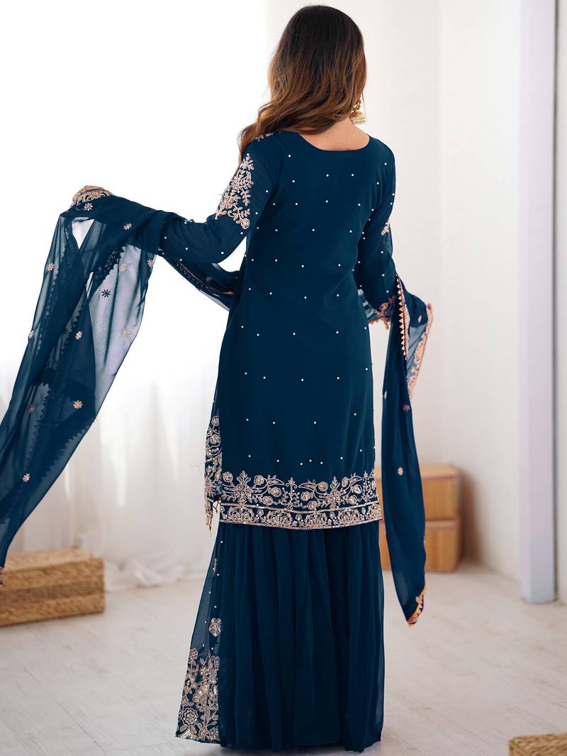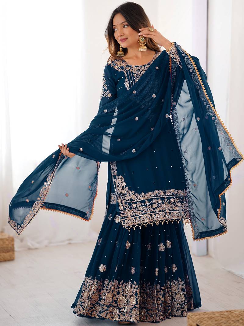 | Product Name | Mesmerizing Blue Embroidered Georgette Festival Wear Sharara Suit | |