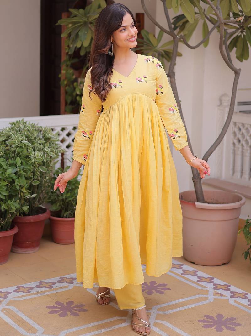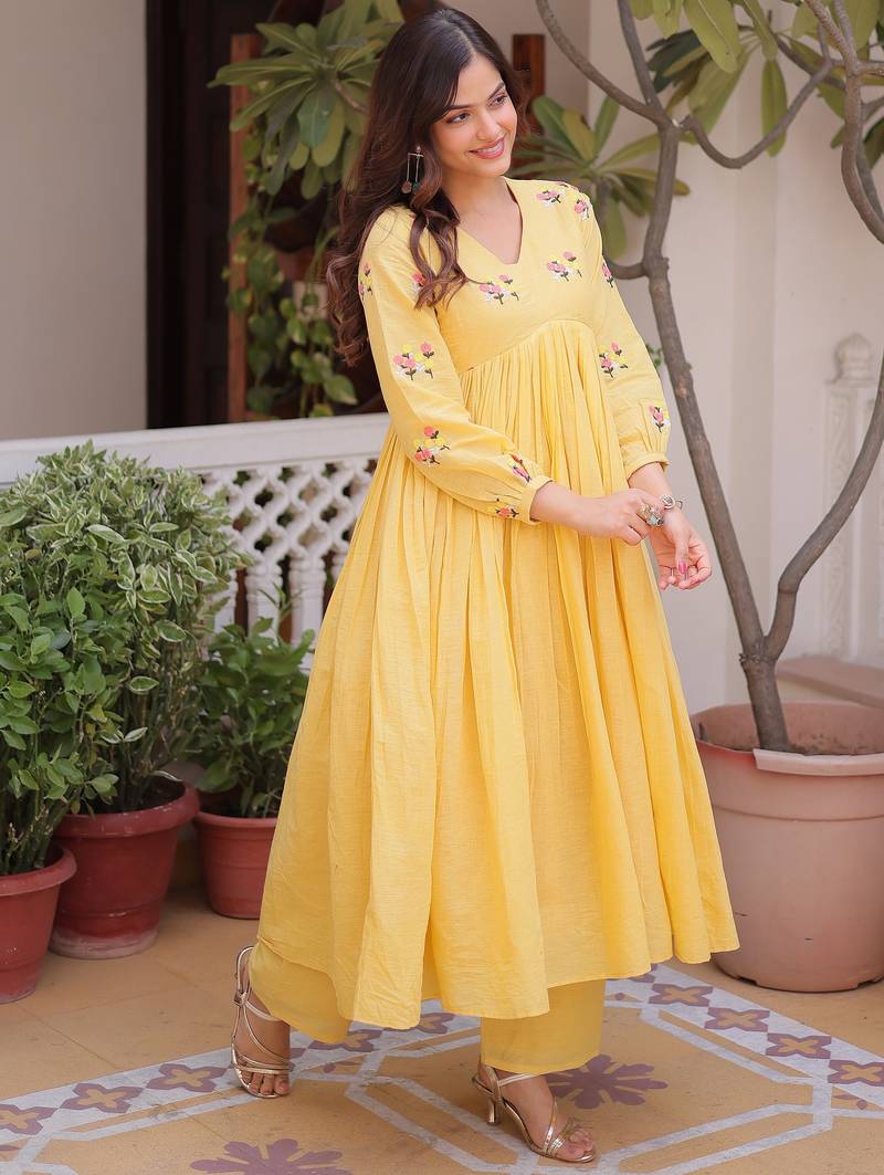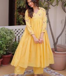 Yellow thread work cotton haldi wear pant suit stitched